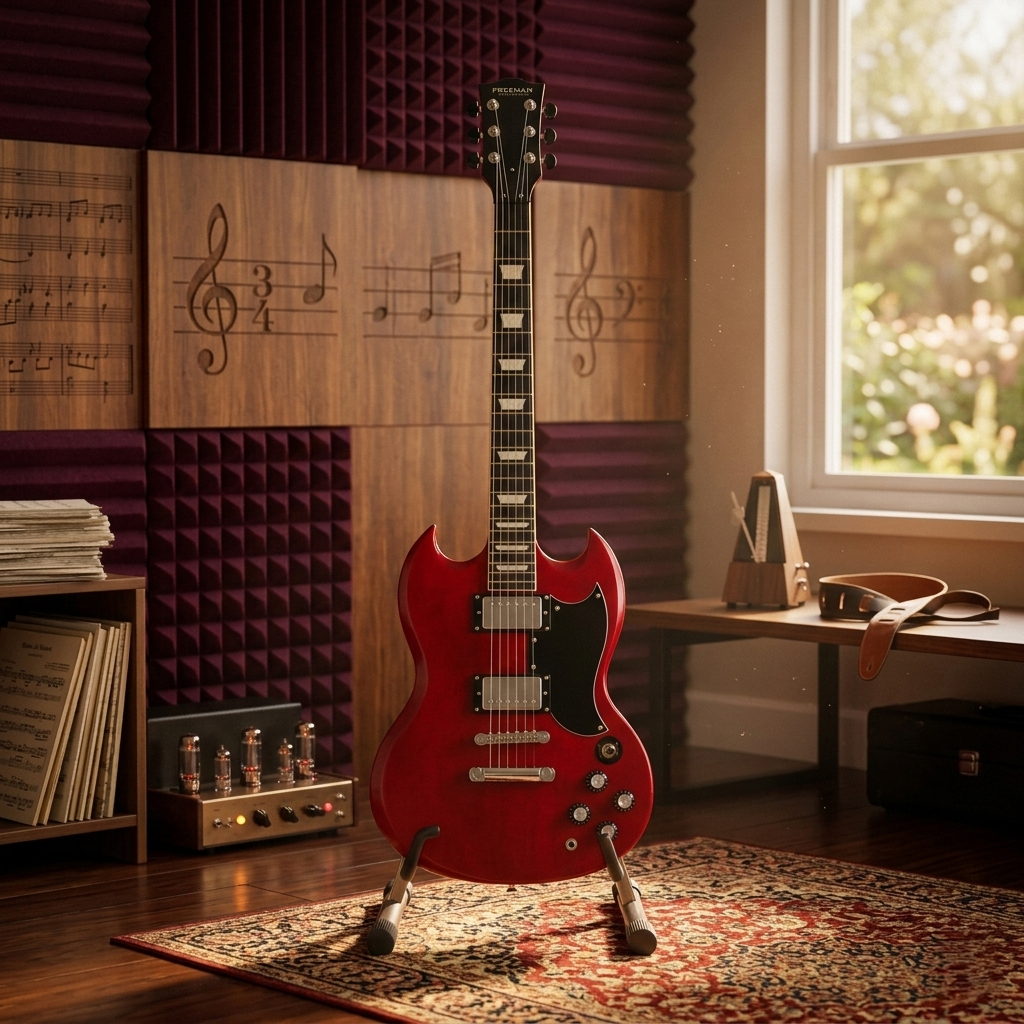 La guitarra eléctrica Freeman SG SSG-10 en acabado Wine Red es mucho más que un instrumento; es una declaración de intenciones. Su cuerpo inspirado en el diseño clásico de doble corte está fabricado en Okoumé, una madera que destaca por ofrecer una durabilidad excepcional y una ligereza sorprendente. Para el guitarrista, esto se traduce en un valor tangible de comodidad absoluta, permitiendo tocar de pie durante horas en ensayos o presentaciones en vivo sin sufrir fatiga, facilitando enormemente el uso diario en traslados hacia clases o estudios de grabación.