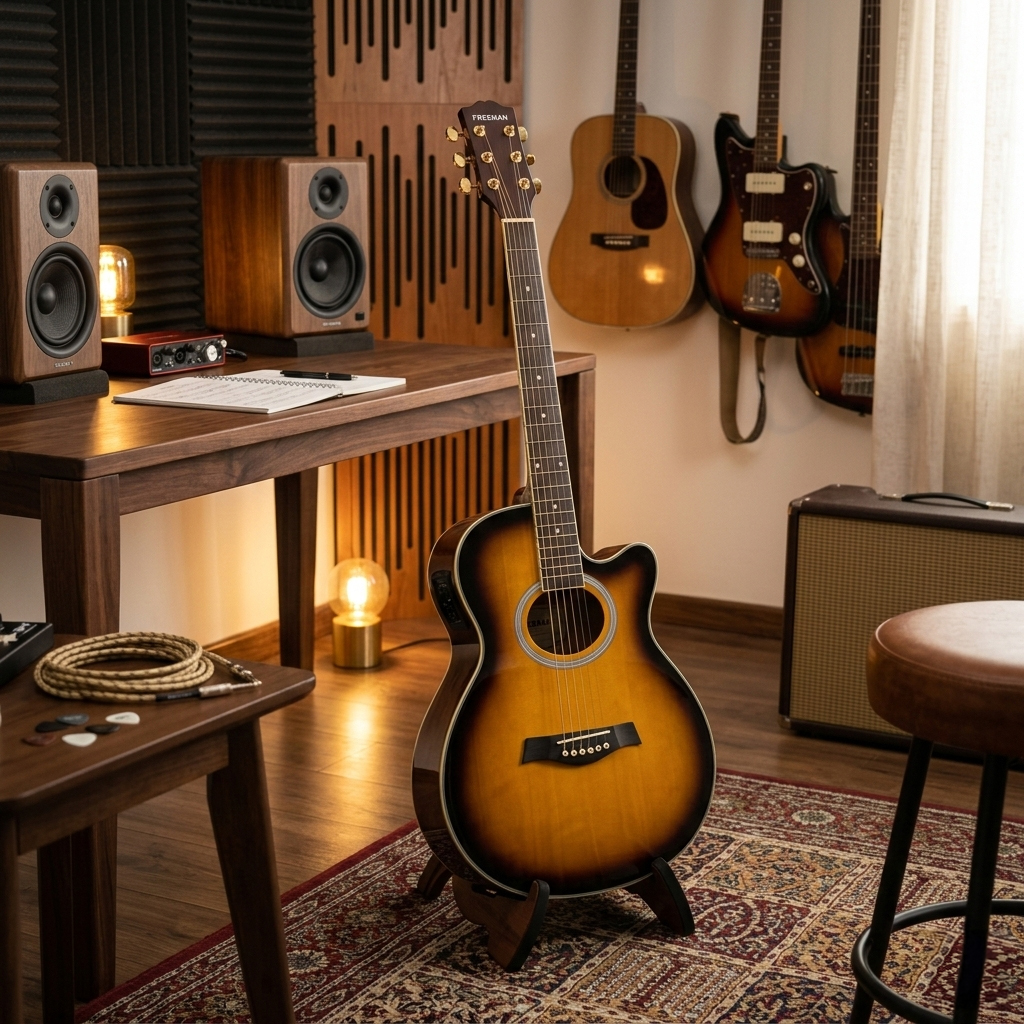 La guitarra electroacústica Freeman FRA95SCET en acabado Sunburst redefine la experiencia de tocar en vivo. Al combinar la profundidad tonal de la tapa de Abeto con un perfil de cuerpo Slim, este instrumento elimina la fatiga habitual en sesiones largas de grabación o actuaciones de pie. La forma Grand Auditorium garantiza una respuesta de frecuencia equilibrada, donde los medios se proyectan con claridad y los agudos mantienen un brillo cristalino. Para el músico activo, esto se traduce en una durabilidad estructural confiable y un manejo mucho más ágil durante los traslados diarios, permitiendo un control superior sobre el instrumento sin sacrificar la potencia real acústica.