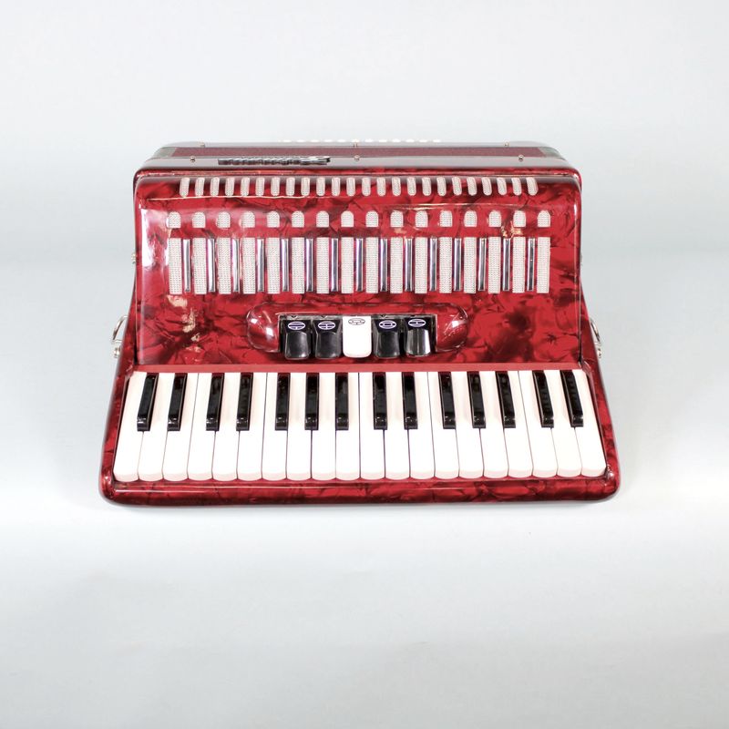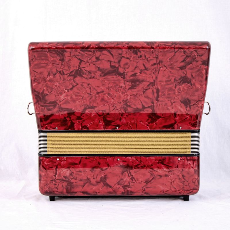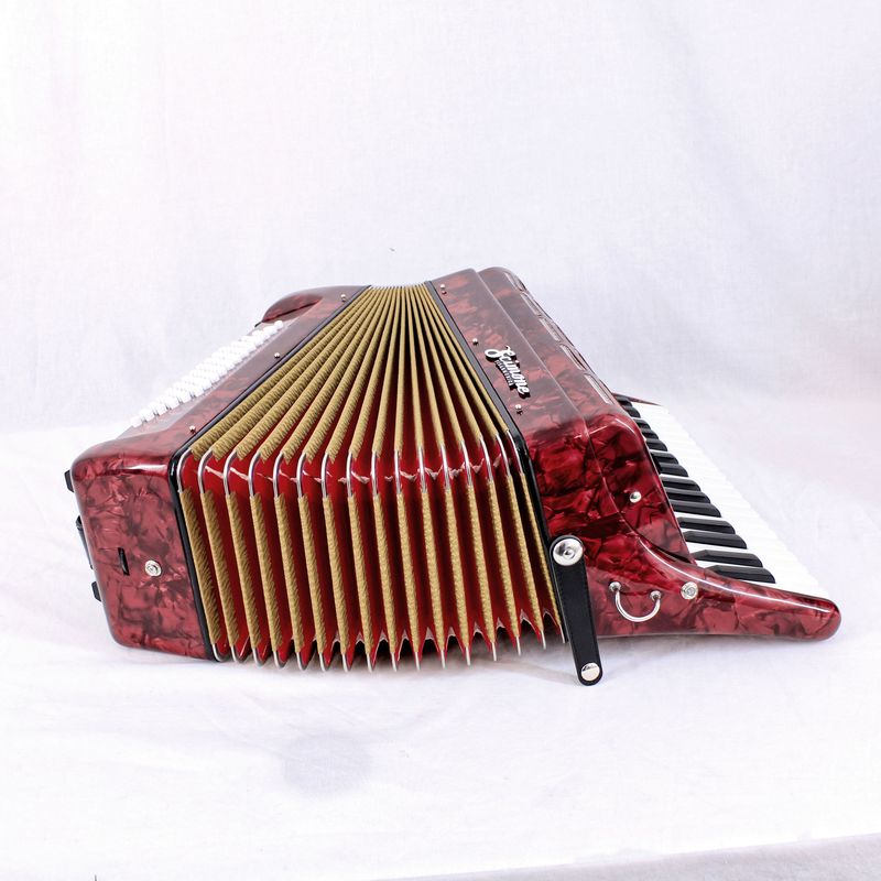 El Scimone de 72 bajos es un acordeón tipo piano diseñado para músicos que buscan un instrumento versátil, confiable y con un look llamativo. Su acabado en rojo perlado destaca en el escenario, mientras que sus 34 teclas combinadas con 72 bajos ofrecen una amplia gama tonal para interpretar desde música folclórica hasta repertorios populares y de estudio.