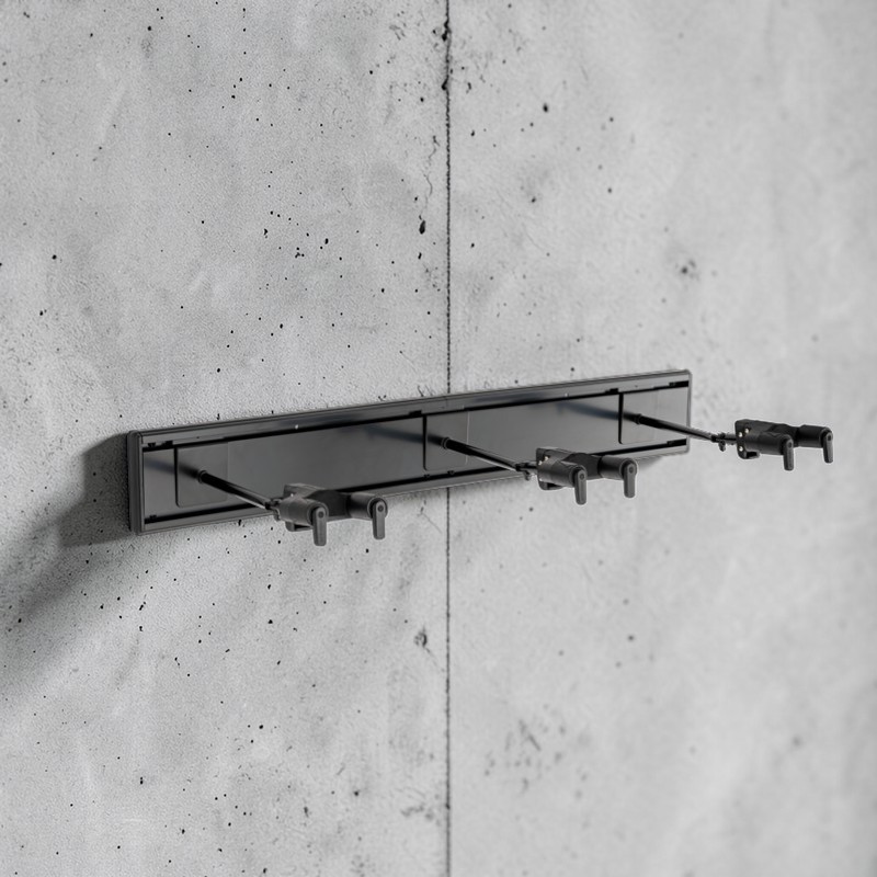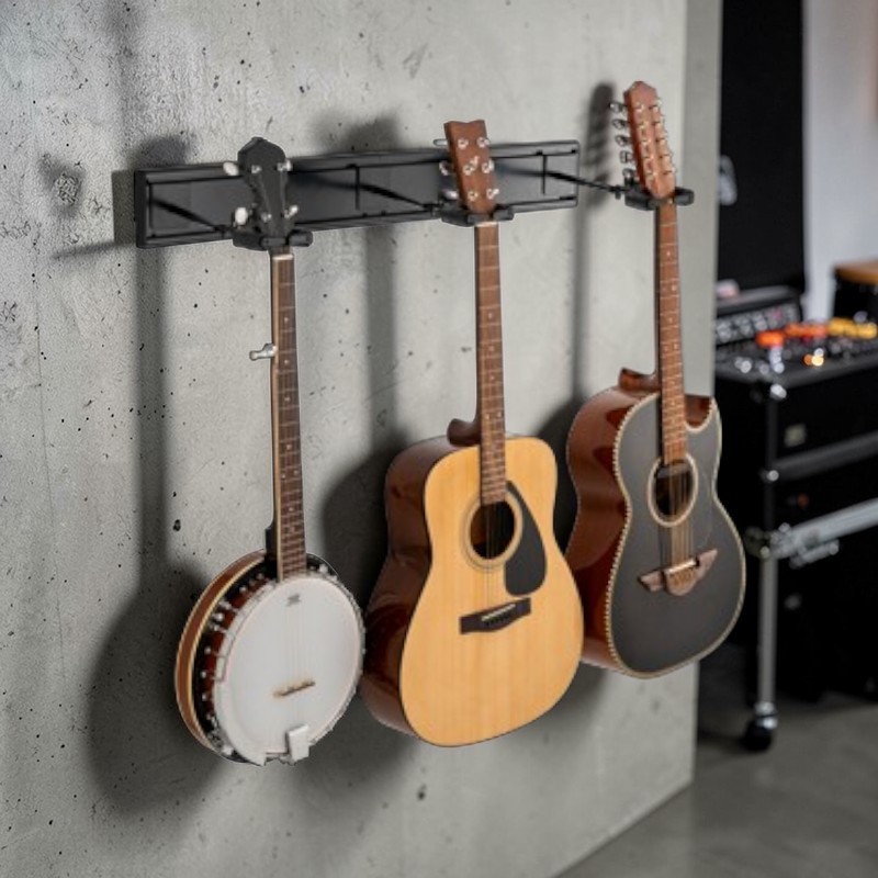 El Hercules GSP403SB es un atril de pared diseñado para sostener de forma segura tres guitarras o bajos, permitiendo mantener los instrumentos organizados y protegidos en estudios, salas de ensayo o espacios de práctica. Su diseño optimiza el uso del espacio en la pared, ofreciendo una solución práctica para almacenar varios instrumentos de forma ordenada y accesible.