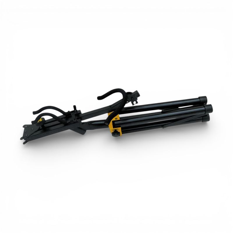 El yugo plegable con pasador de bloqueo permite asegurar la posición superior del soporte, mientras que el sistema de tornillo central facilita un armado y desmontaje rápido y sencillo, ideal para transporte y montaje en escenarios o salas de ensayo.