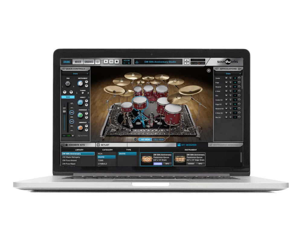 Los kits V-Drums 5 pueden controlar DW Soundworks, un instrumento de software que funciona como aplicación independiente o plug-in de DAW. Muchas expansiones reproducen fielmente las V-Drums Instrument Expansions, permitiendo trabajar en software sin perder el sonido ni la respuesta del módulo.