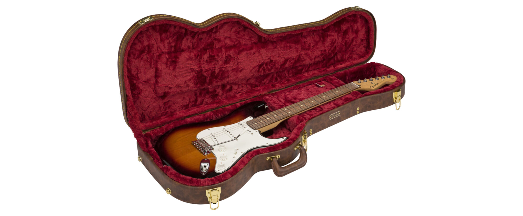 El estuche incorpora cierres de acero chapados en oro (draw latches) y un cierre de seguridad con llave. El asa de transporte, con núcleo de acero y envuelta en vinilo marrón, garantiza un agarre cómodo y firme. Además, su diseño ha sido optimizado para ajustarse a la mayoría de los modelos Stratocaster (diestros) y Telecaster (diestros y zurdos), ofreciendo una solución de protección versátil para múltiples estilos de guitarra eléctrica.