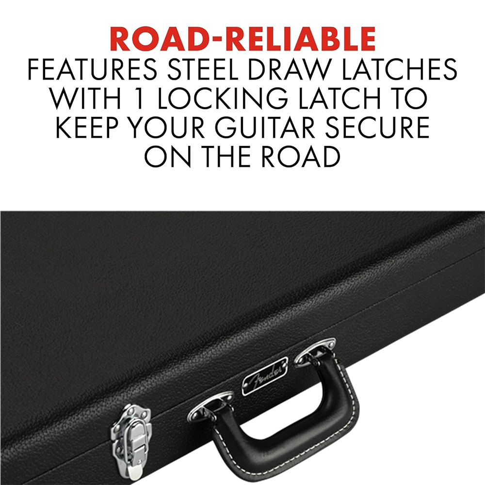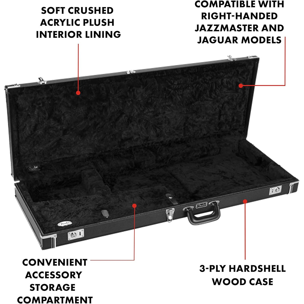 Este estuche de madera presenta un elegante acabado en vinilo negro texturizado con un asa de transporte de acero, reforzada con vinilo, que asegura un agarre cómodo y resistente. El diseño de la serie Classic mantiene una estética sobria y profesional. Ha sido moldeado específicamente para adaptarse a la mayoría de las guitarras Jazzmaster y Jaguar de orientación diestra, garantizando un ajuste perfecto que minimiza el movimiento interno del instrumento y maximiza su protección durante el transporte