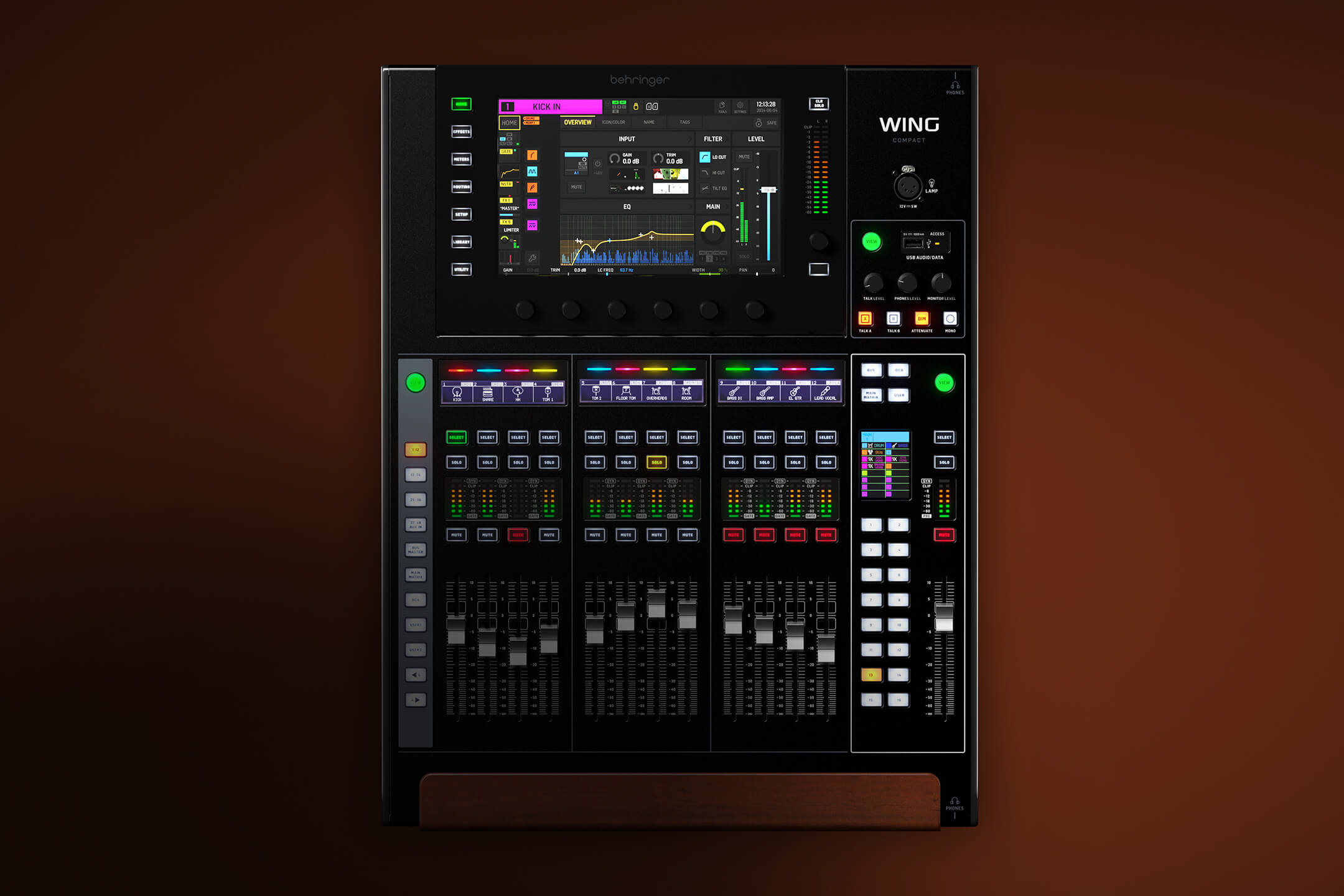 El corazón operativo de la WING Compact es su pantalla táctil de 10.1 pulgadas con ajuste de ángulo continuo, que ofrece una visibilidad perfecta bajo cualquier iluminación de escenario. Complementada con 13 faders motorizados de 100 mm y una sección de control maestro optimizada, la consola permite ajustes rápidos y precisos mediante 16 teclas de acceso rápido y pantallas LCD individuales por canal. Este valor tangible en la velocidad de operación es crítico en situaciones de mezcla de monitores o eventos en vivo, donde el acceso inmediato a los parámetros de ecualización y dinámica marca la diferencia entre un show estándar y uno profesional.