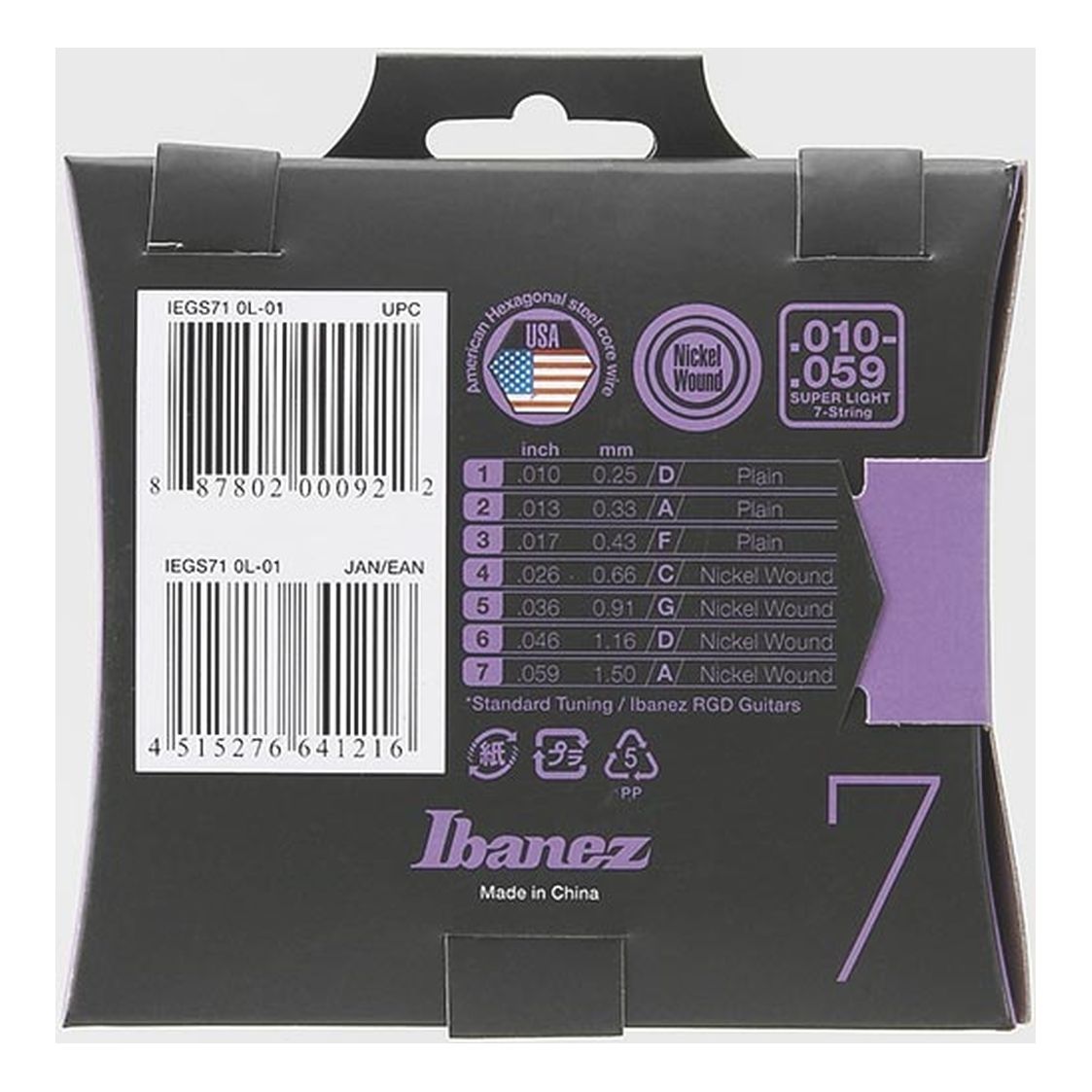 El set IEGS71 incluye los siguientes calibres, diseñados para ofrecer una tensión equilibrada en guitarras de siete cuerdas: