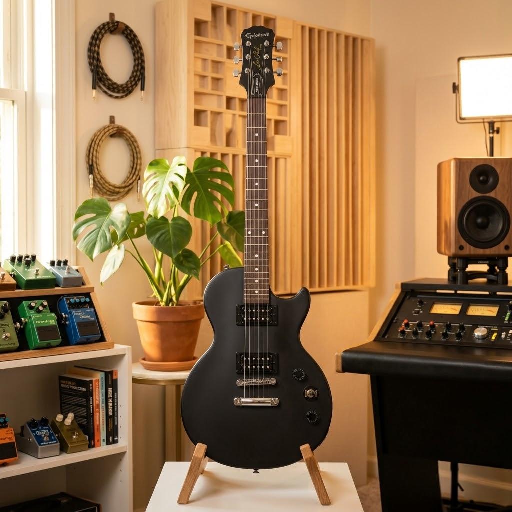 La Epiphone Les Paul Special VE en color Vintage Ebony no solo es una guitarra eléctrica de cuerpo sólido, es un instrumento que respira historia. Su acabado mate desgastado elimina los reflejos excesivos y las huellas dactilares, permitiendo que la madera respire y vibre con naturalidad. Esta elección de diseño no es solo visual; ofrece una sensación táctil orgánica que suele encontrarse en instrumentos de gamas superiores, ideal para el músico que busca un look profesional y auténtico desde el primer día.