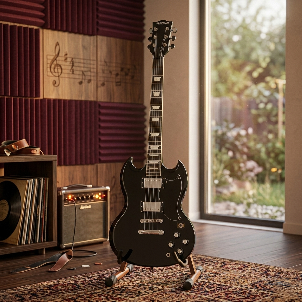 La guitarra eléctrica Freeman SG SSG-10 captura la esencia visual y sonora de uno de los diseños más influyentes en la historia de la música. Su cuerpo fabricado en Okoumé no solo ofrece una estética imponente en acabado negro brillante, sino que proporciona un valor tangible de ligereza extrema. Esta característica es vital para evitar la fatiga durante ensayos prolongados o para garantizar la comodidad en el uso diario en traslados, permitiendo que el guitarrista se mueva con total libertad en el escenario sin comprometer la solidez estructural del instrumento.