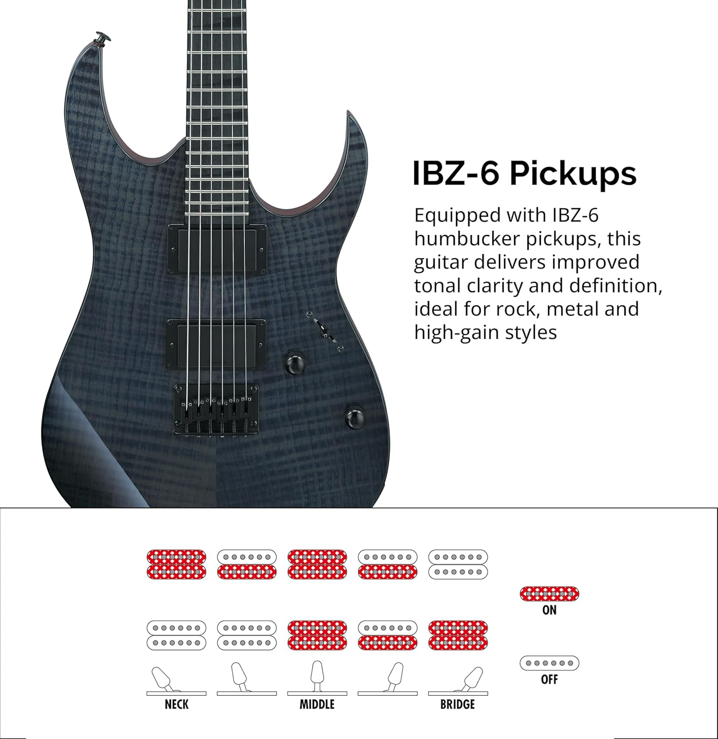 Equipada con un par de cápsulas humbucker IBZ-6 de cerámica, esta guitarra entrega una salida de señal contundente y moderna. Estas cápsulas están diseñadas para ofrecer una respuesta de frecuencia equilibrada, con bajos ajustados y agudos que cortan la mezcla de audio sin resultar estridentes. Ya sea que busques una distorsión de alta ganancia o un retorno limpio con mucho cuerpo, el sistema pasivo cerámico garantiza una potencia real que responde dinámicamente al ataque de la uñeta, convirtiéndola en una máquina de precisión para géneros pesados y rock contemporáneo.