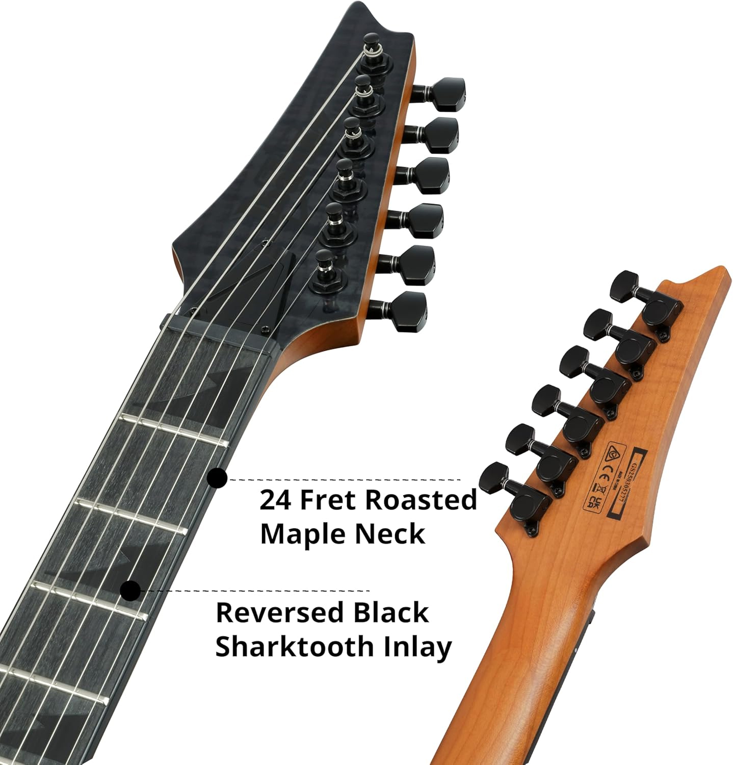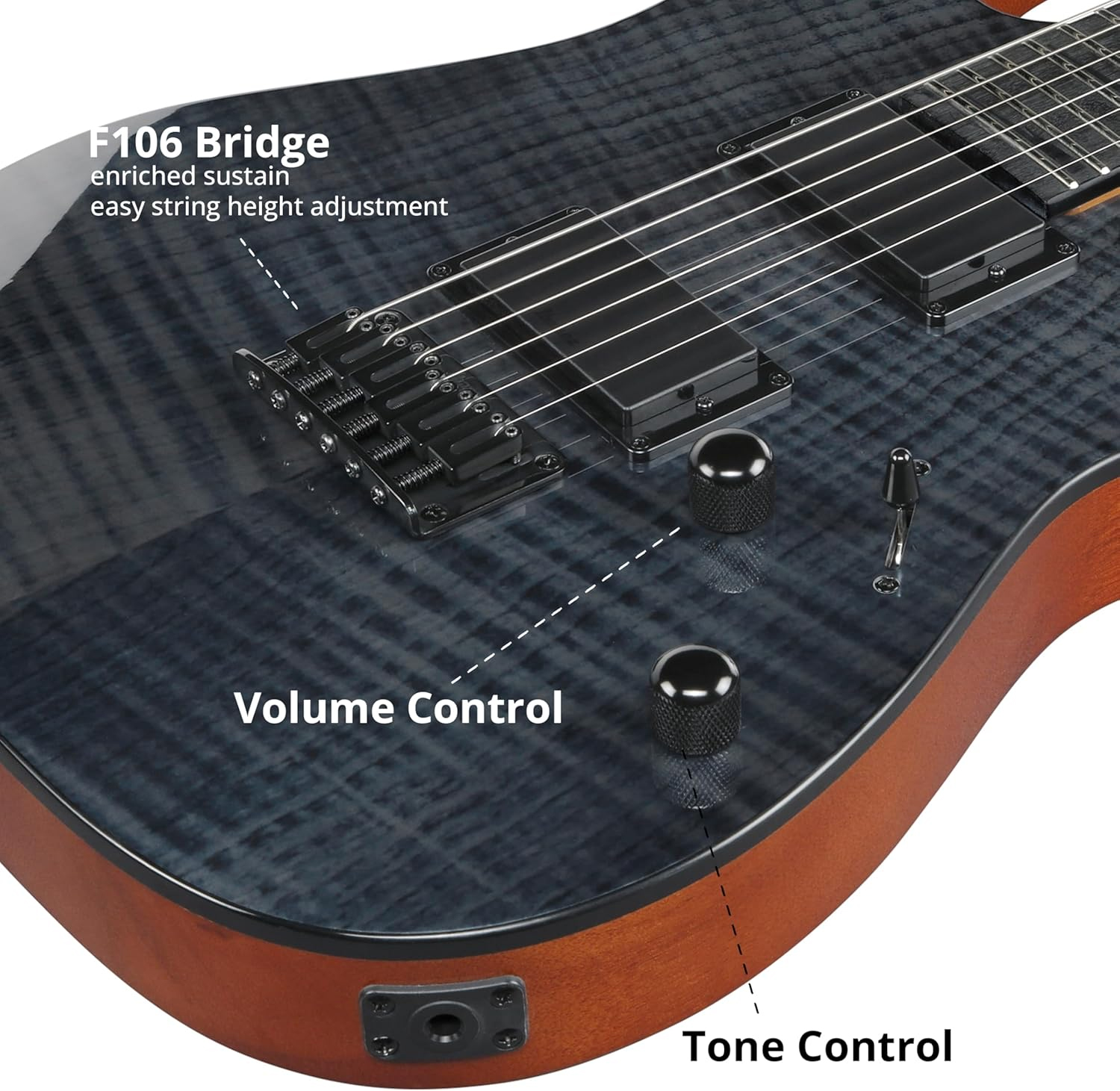 El cuerpo de Okoume, ligero y resonante, está coronado por una tapa de arce flameado Art Grain en un impactante acabado Transparent Indigo Black. Esta combinación no solo ofrece una estética premium, sino que el diseño de doble cutaway profundo permite un acceso sin restricciones a los 24 trastes medianos. El diapasón de Purpleheart con ribete (binding) e incrustaciones de diente de tiburón invertidas refuerza su carácter metálico, proporcionando una superficie de juego estable que mantiene la claridad armónica en cada nota del diapasón.