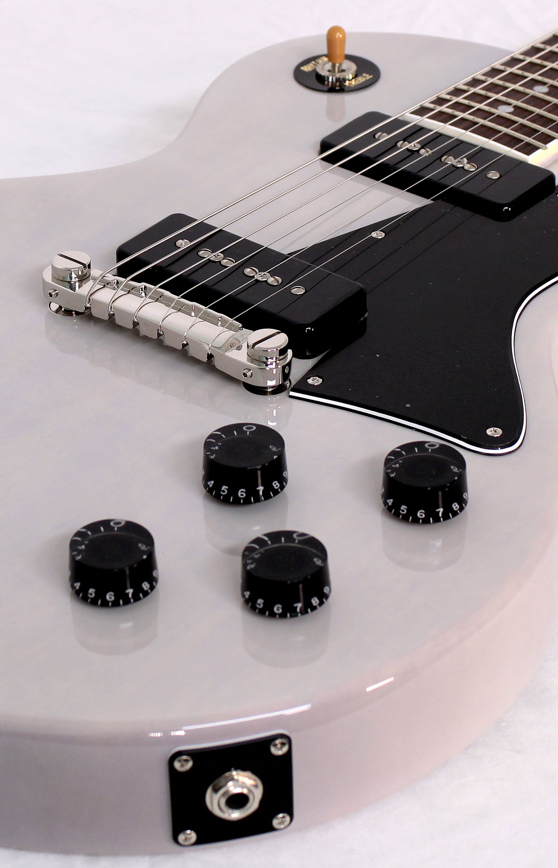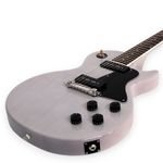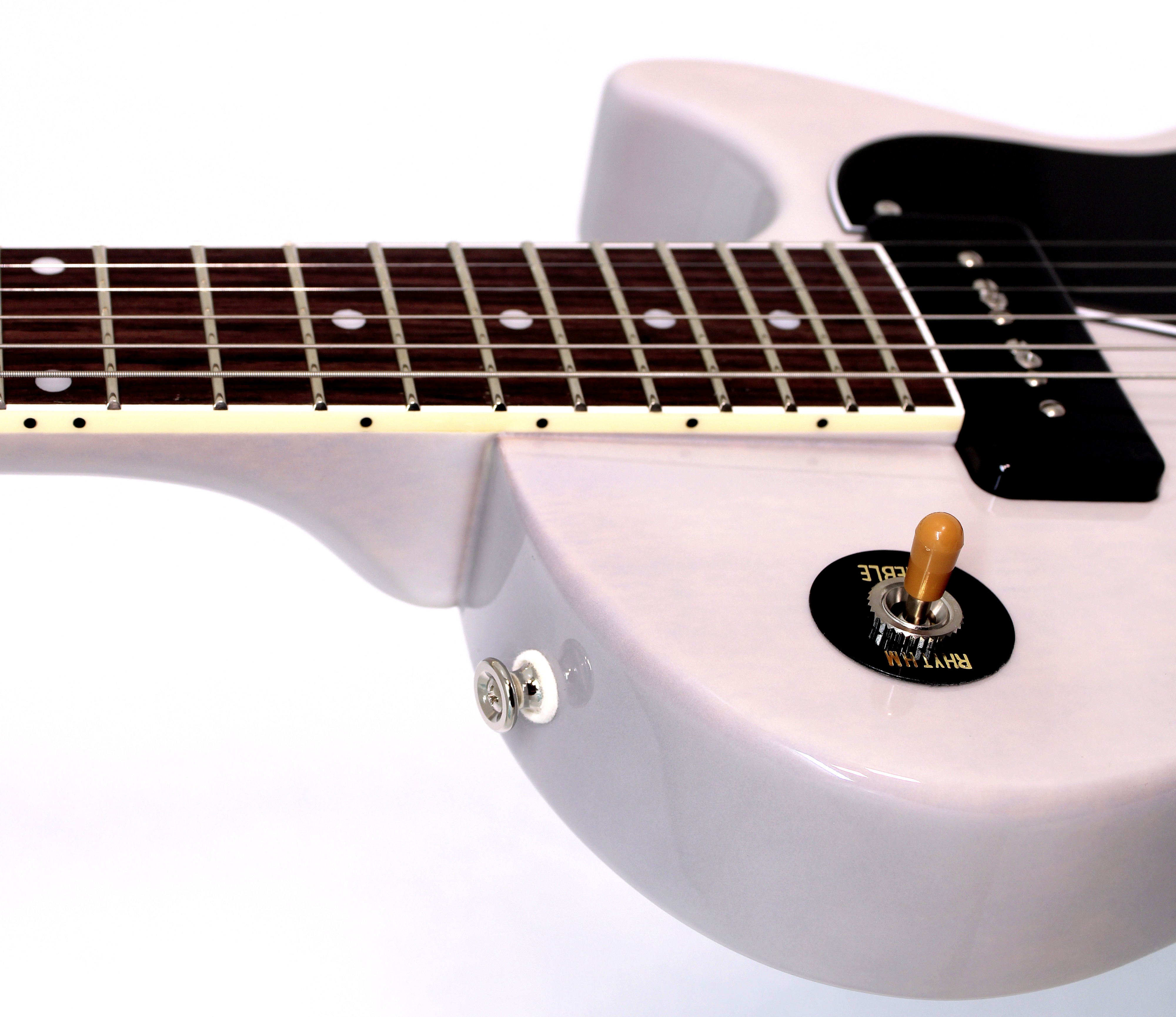 El acabado See Through White permite ver el veteado de la madera debajo de una capa blanca sutil, dándole un aire sofisticado y artesanal. El hardware niquelado, junto con el pickguard de 4 capas, complementan la estética elegante sin sacrificar funcionalidad.