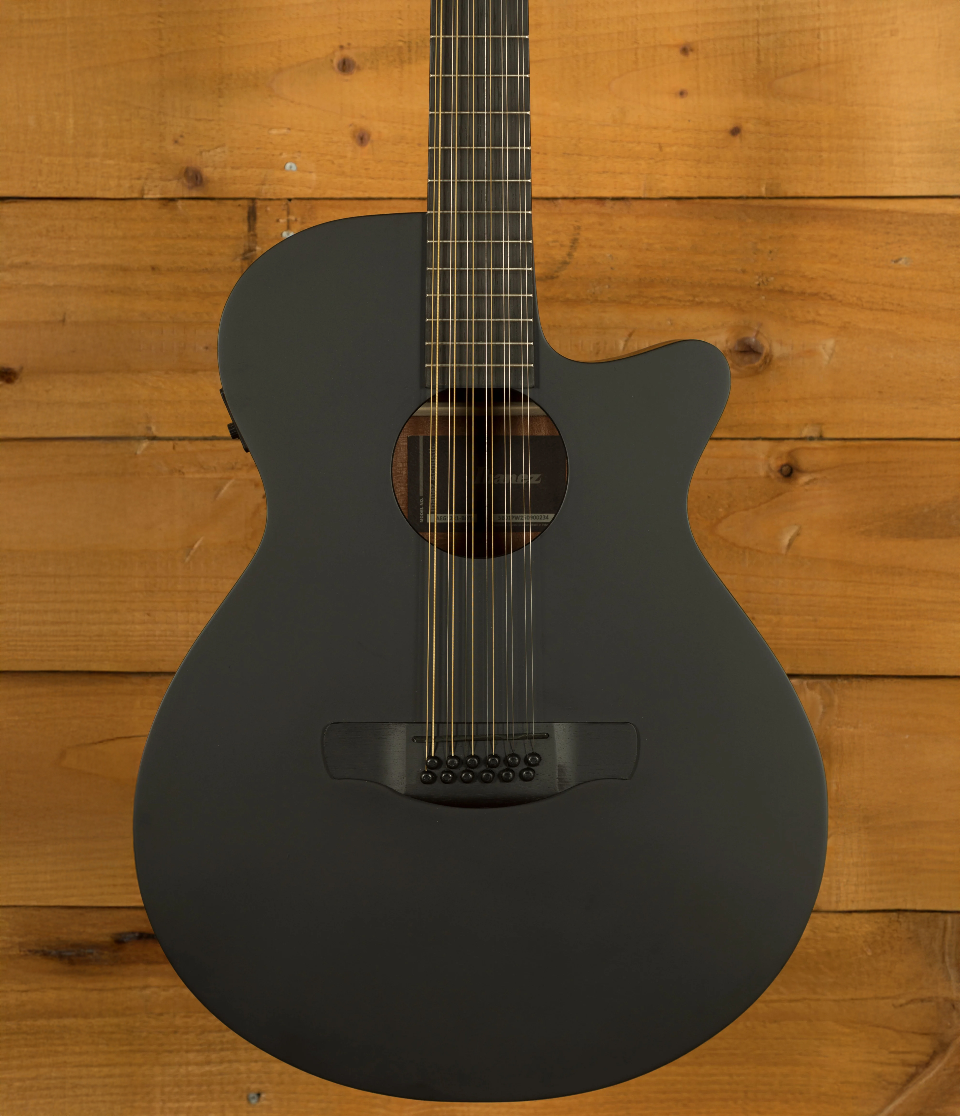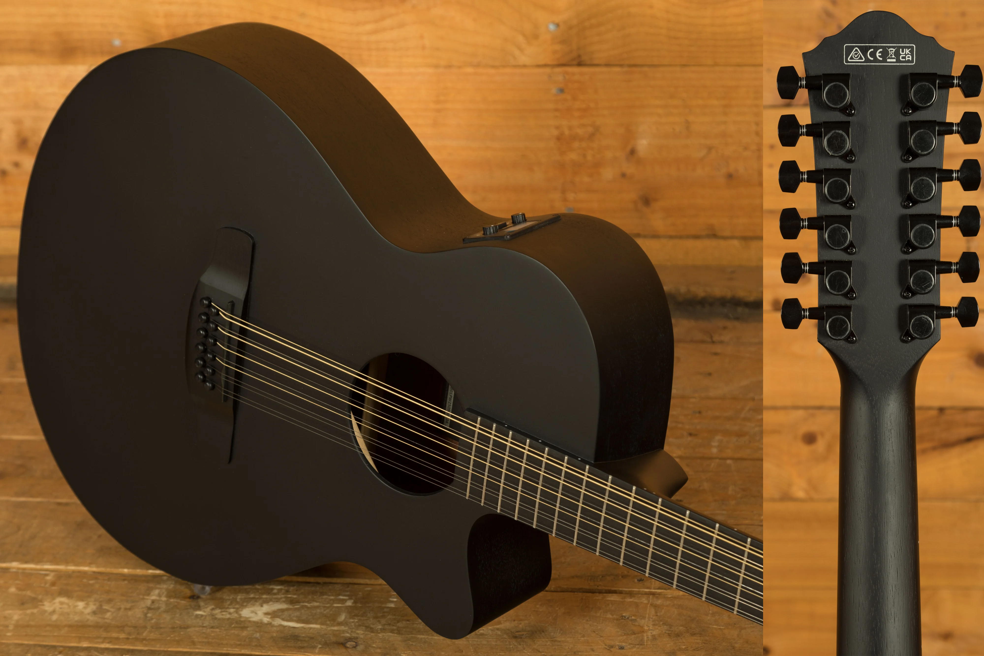 La tapa de abeto (Spruce) es el estándar de oro para la definición acústica, proporcionando una claridad impecable que permite que cada uno de los seis pares de cuerdas brille con independencia. Los aros y fondo de Sapele complementan esta estructura con un rango medio cálido y una brillantez que realza el efecto de chorus natural propio de las 12 cuerdas. El diapasón y el puente de ébano Macassar no solo aportan una estética lujosa en negro mate, sino que generan una respuesta rápida y un sustain enriquecido. El valor tangible para el músico es un retorno sonoro lleno de armónicos, con bajos ajustados y un ataque sólido que corta a través de cualquier mezcla profesional.