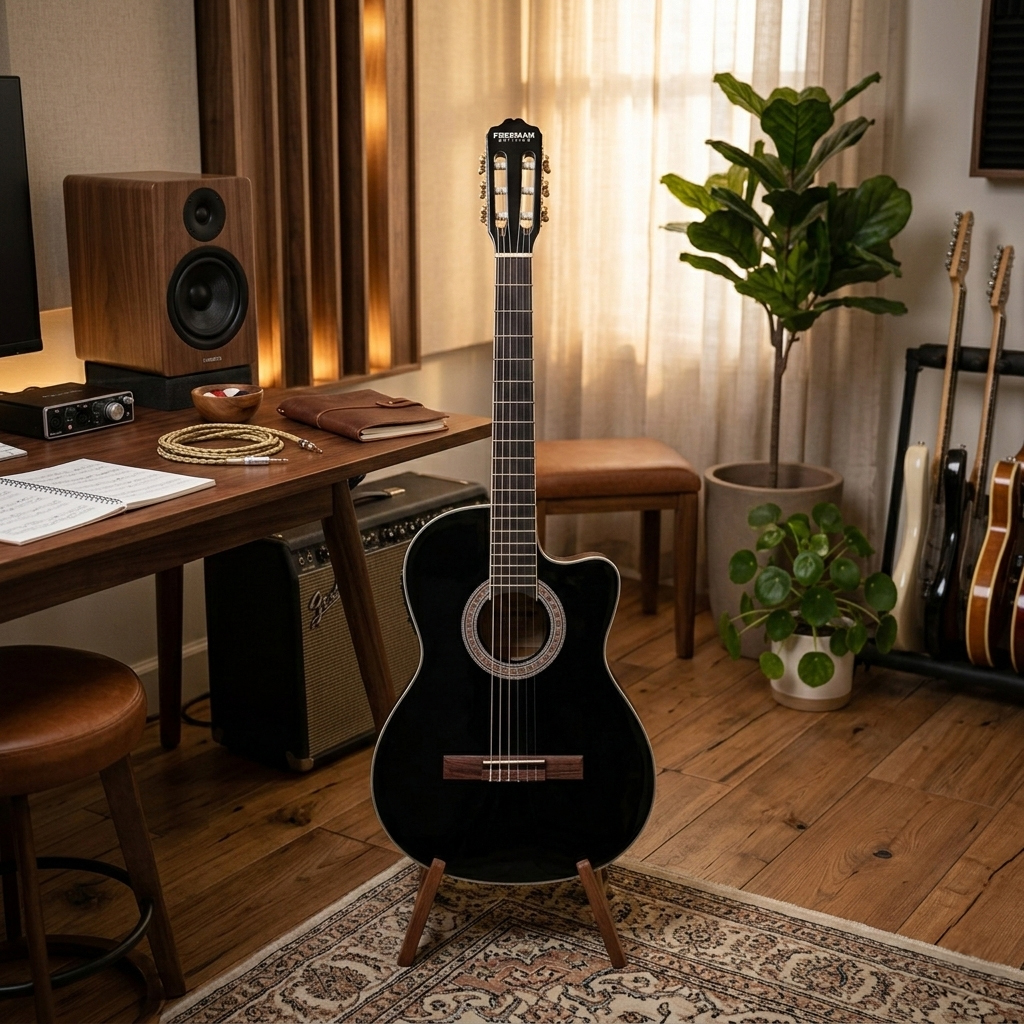La guitarra clásica electroacústica Freeman FRA95NCET en su edición delgada redefine el estándar de confort para el guitarrista que se presenta en vivo. Su estructura con tapa de Abeto ofrece una respuesta de frecuencia equilibrada, donde los agudos brillan con claridad y los medios poseen una calidez orgánica. Al ser un modelo Slim, reduce significativamente el volumen de la caja sin sacrificar la proyección, lo que se traduce en una durabilidad y manejabilidad superiores durante traslados constantes y sesiones de estudio prolongadas. Este diseño ergonómico evita la fatiga en el brazo derecho, permitiendo una interpretación más natural y fluida.