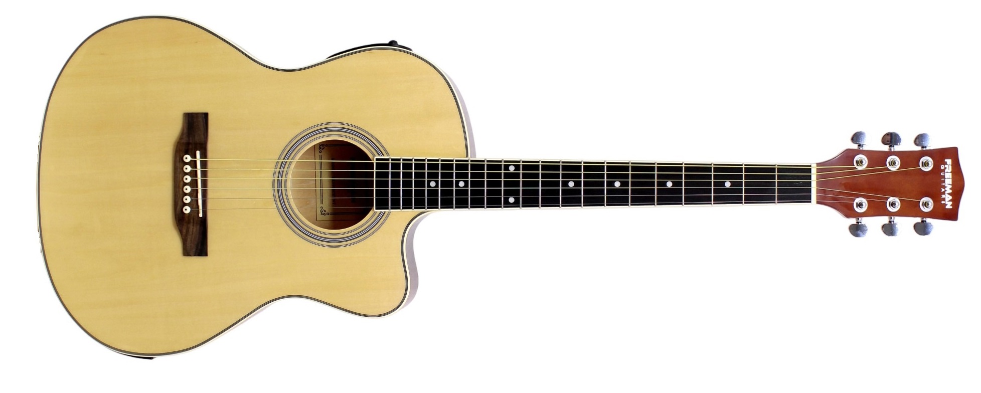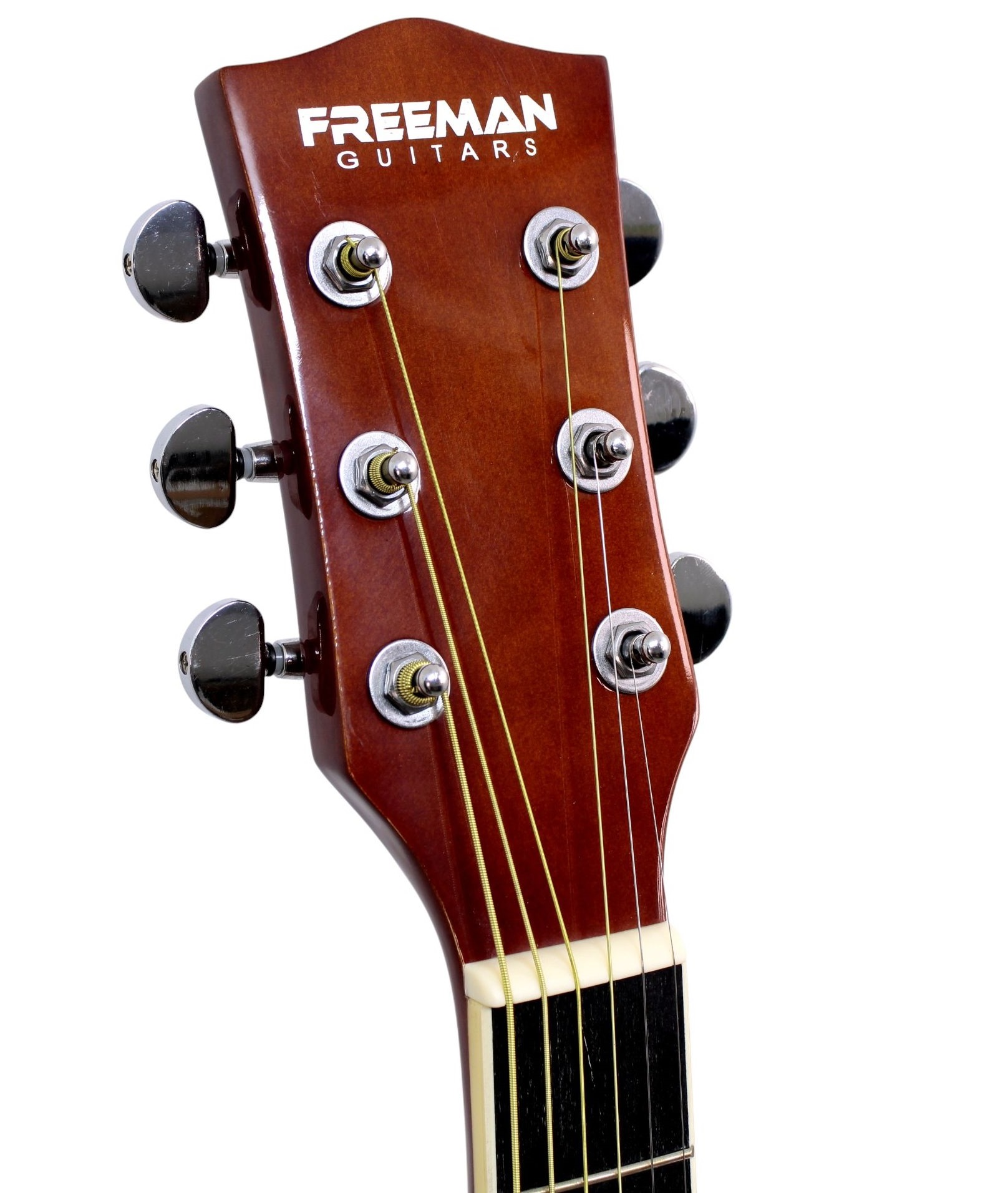 La guitarra electroacústica Freeman FRA95SCET de cuerpo delgado con cuerdas de metal, fácil de usar, fue diseñada para ayudar a los músicos principiantes a tener un instrumento cómodo para tocar.