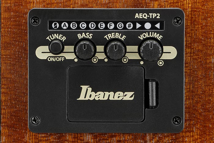 La electrónica incluye una cápsula Ibanez T-bar Undersaddle junto con el preamplificador AEQ-TP2 con afinador integrado, lo que permite amplificar el instrumento con fidelidad y realizar ajustes rápidos durante presentaciones en vivo o sesiones de grabación.