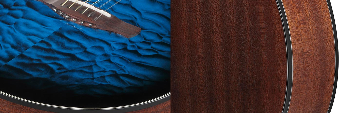 La tapa de Quilted Maple Art Grain sobre Basswood no solo proyecta una imagen visual sofisticada en acabado Transparent Black, sino que proporciona un tono equilibrado con una nitidez superior. Los aros y fondo de Sapele complementan esta arquitectura sonora aportando un rango medio con mucho cuerpo y una brillantez que destaca en cualquier mezcla acústica. El diapasón de Rosewood añade esa suavidad táctil necesaria para pasajes veloces, entregando un retorno sonoro sólido y enfocado. Es un instrumento equilibrado que combina el impacto visual de las maderas exóticas con la precisión técnica que define a la marca, asegurando una proyección clara tanto en entornos íntimos como en escenarios amplificados.