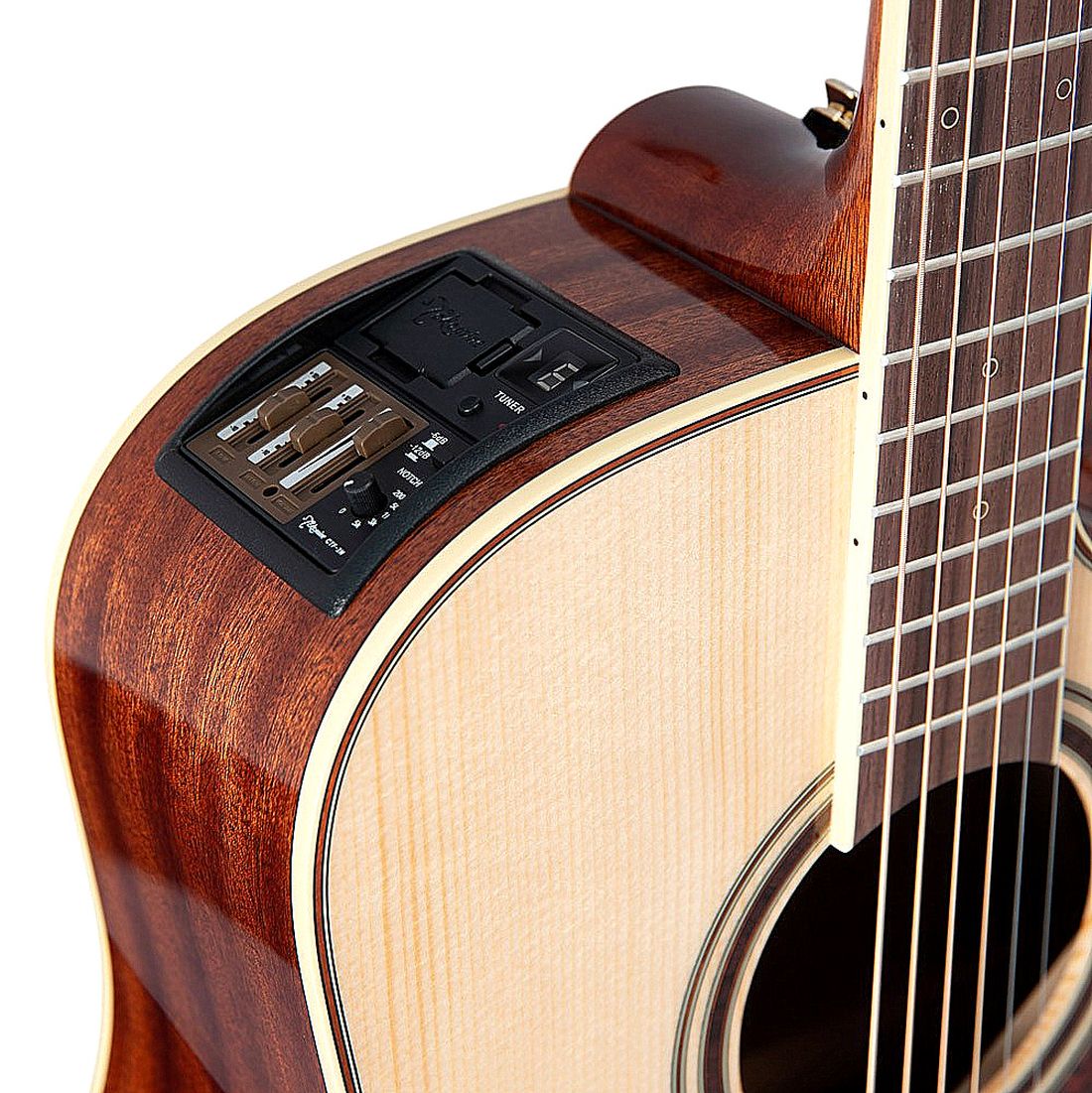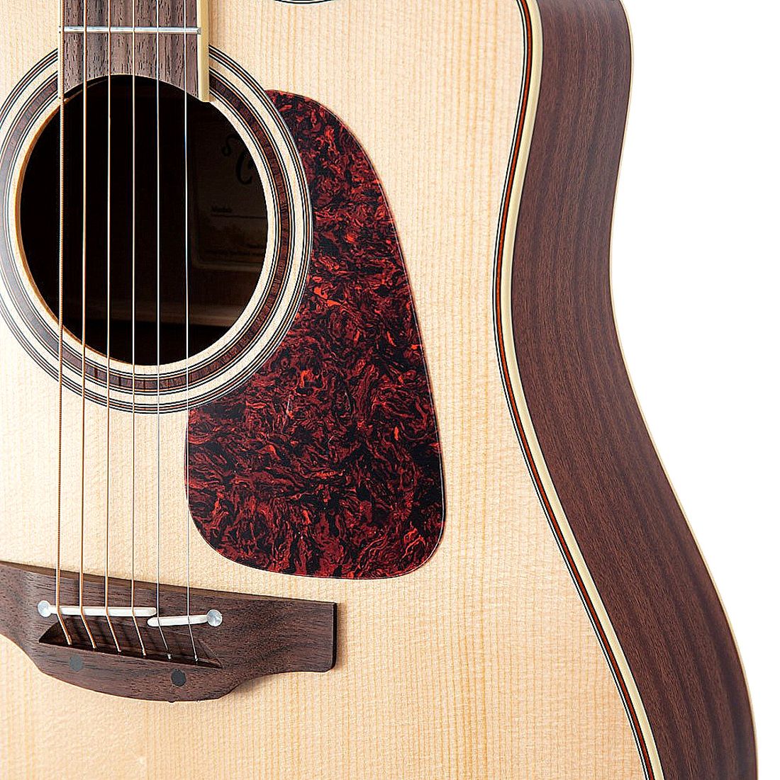Otras características que mejoran el rendimiento incluyen un cómodo cutaway veneciano para un fácil acceso a los tramos superiores del diapasón, y el puente de palo rosa dividido proporciona una entonación más precisa, mientras que el puente de palo rosa sin clavijas hace que los cambios de cuerdas sean muy sencillos.