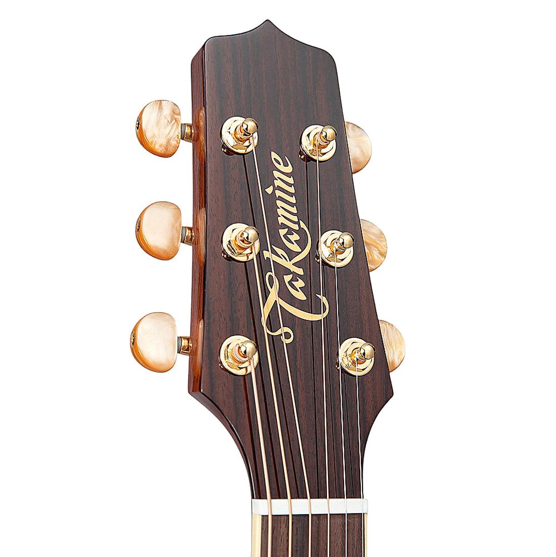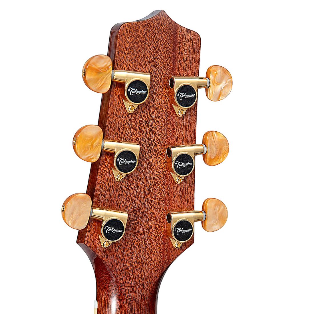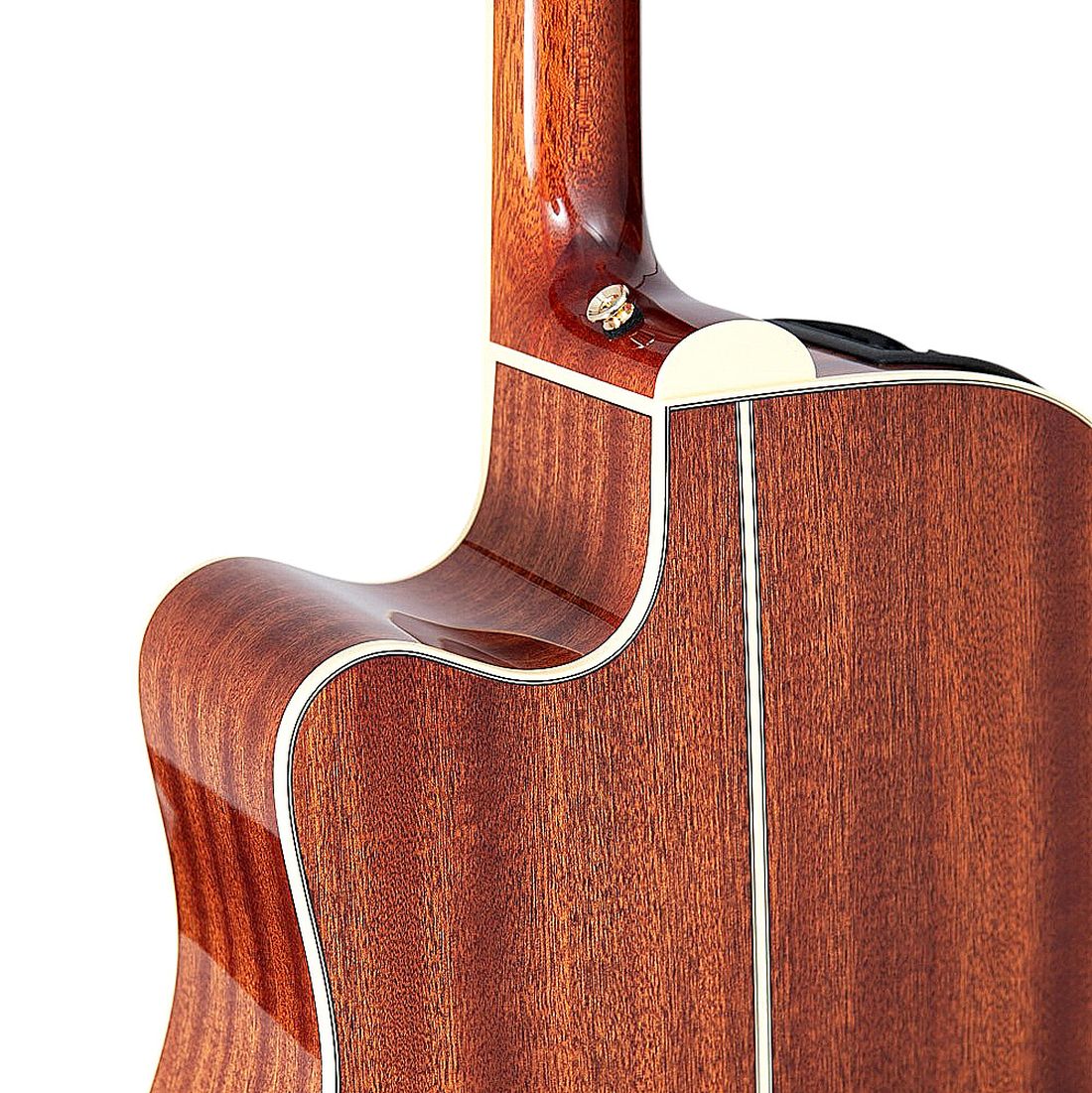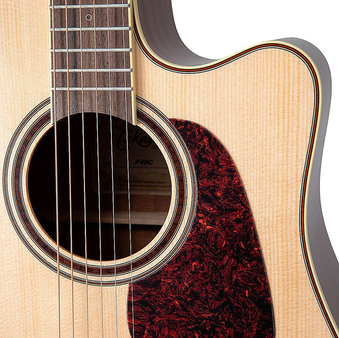 El cutaway P4DC dreadnought de Takamine combina tradición con refinamientos contemporáneos, incluyendo una tapa de abeto macizo resonante con refuerzos en forma de "X" para una claridad y proyección superiores, y un fondo de sapeli macizo con aros de sapeli para un sonido rico y cálido.