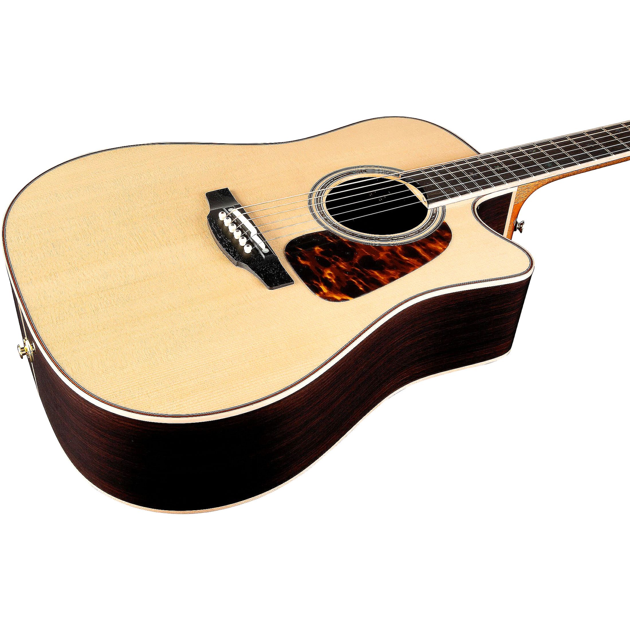 El cuerpo tipo Dreadnought con corte veneciano permite un acceso cómodo a los trastes superiores y una presencia poderosa ideal para escenarios o estudio.