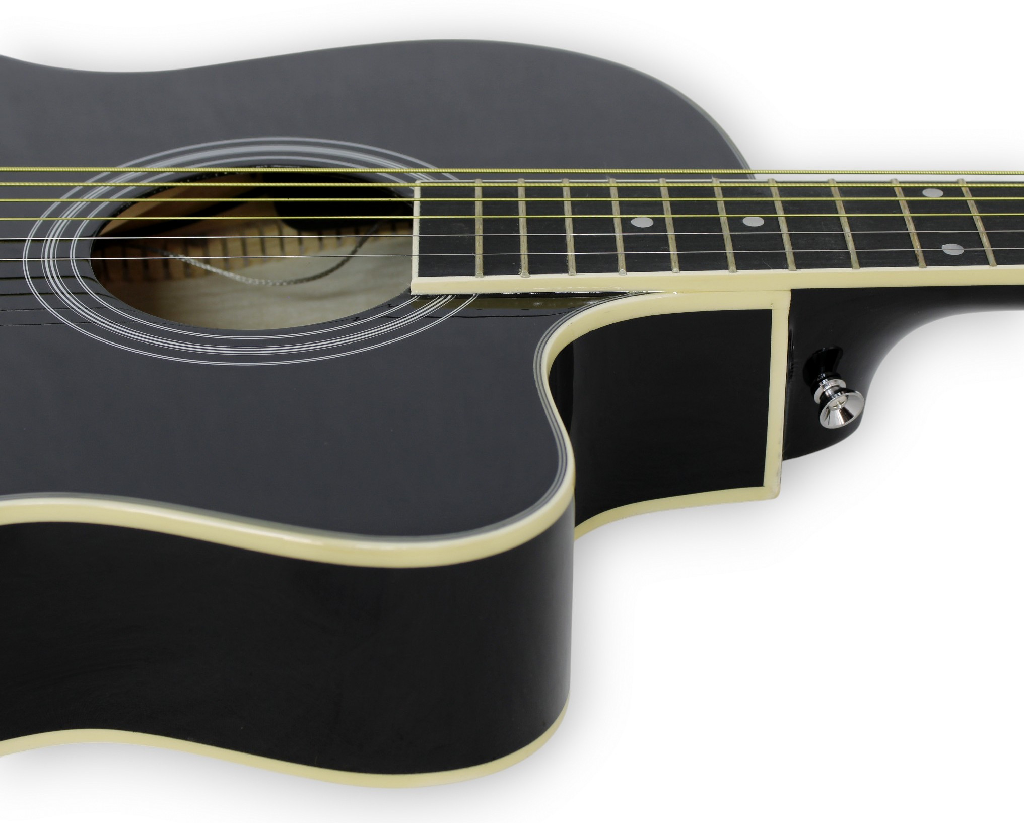 El cuerpo está diseñado para ofrecer un equilibrio entre comodidad y proyección sonora, entregando un tono claro, definido y con buena presencia en medios y agudos, propio de las cuerdas de metal. Su construcción sólida asegura estabilidad estructural y una respuesta consistente tanto en uso acústico como amplificado.