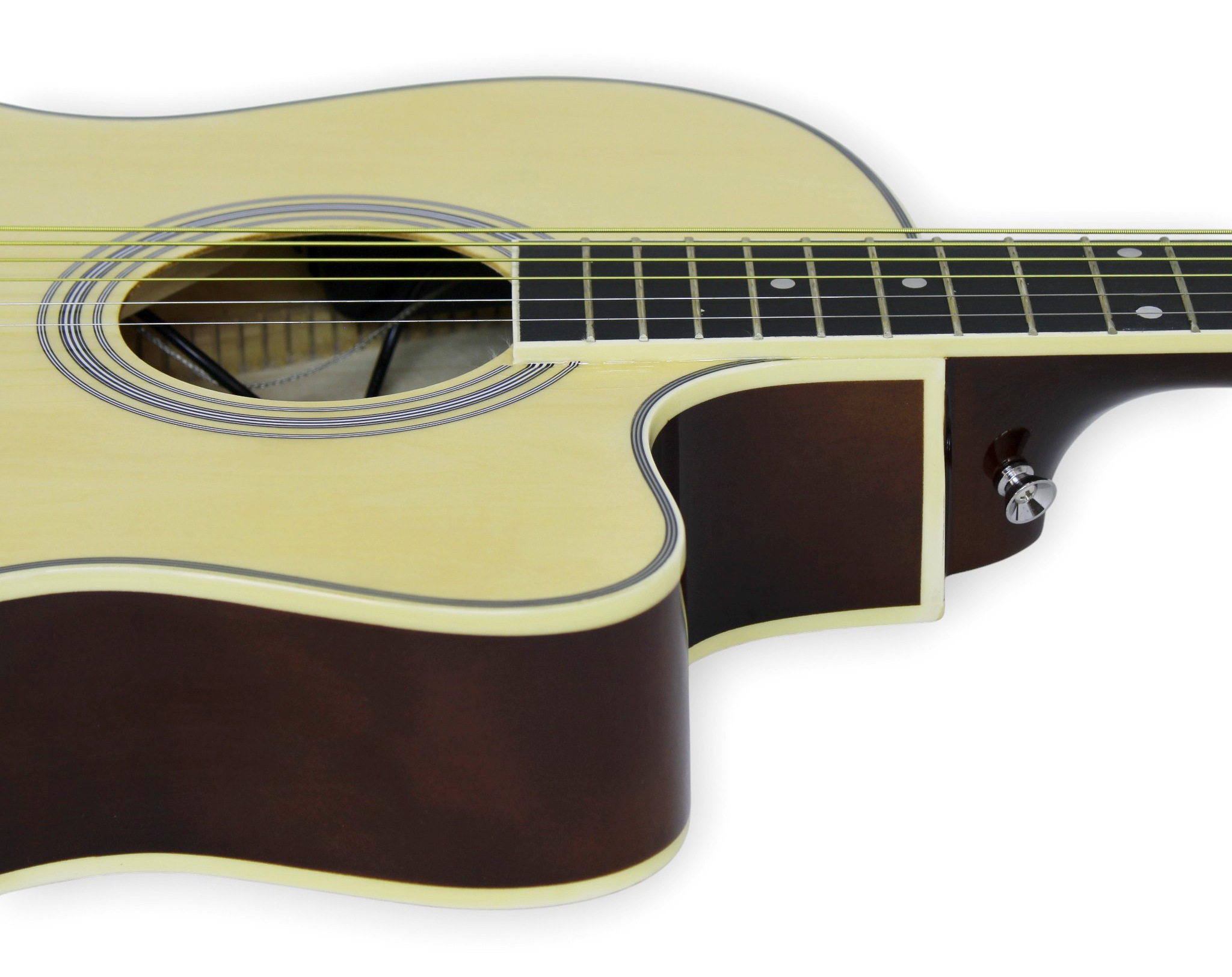 El cuerpo está diseñado para ofrecer un equilibrio entre comodidad y proyección sonora, entregando un tono claro, definido y con buena presencia en medios y agudos, propio de las cuerdas de metal. Su construcción sólida asegura estabilidad estructural y una respuesta consistente tanto en uso acústico como amplificado.