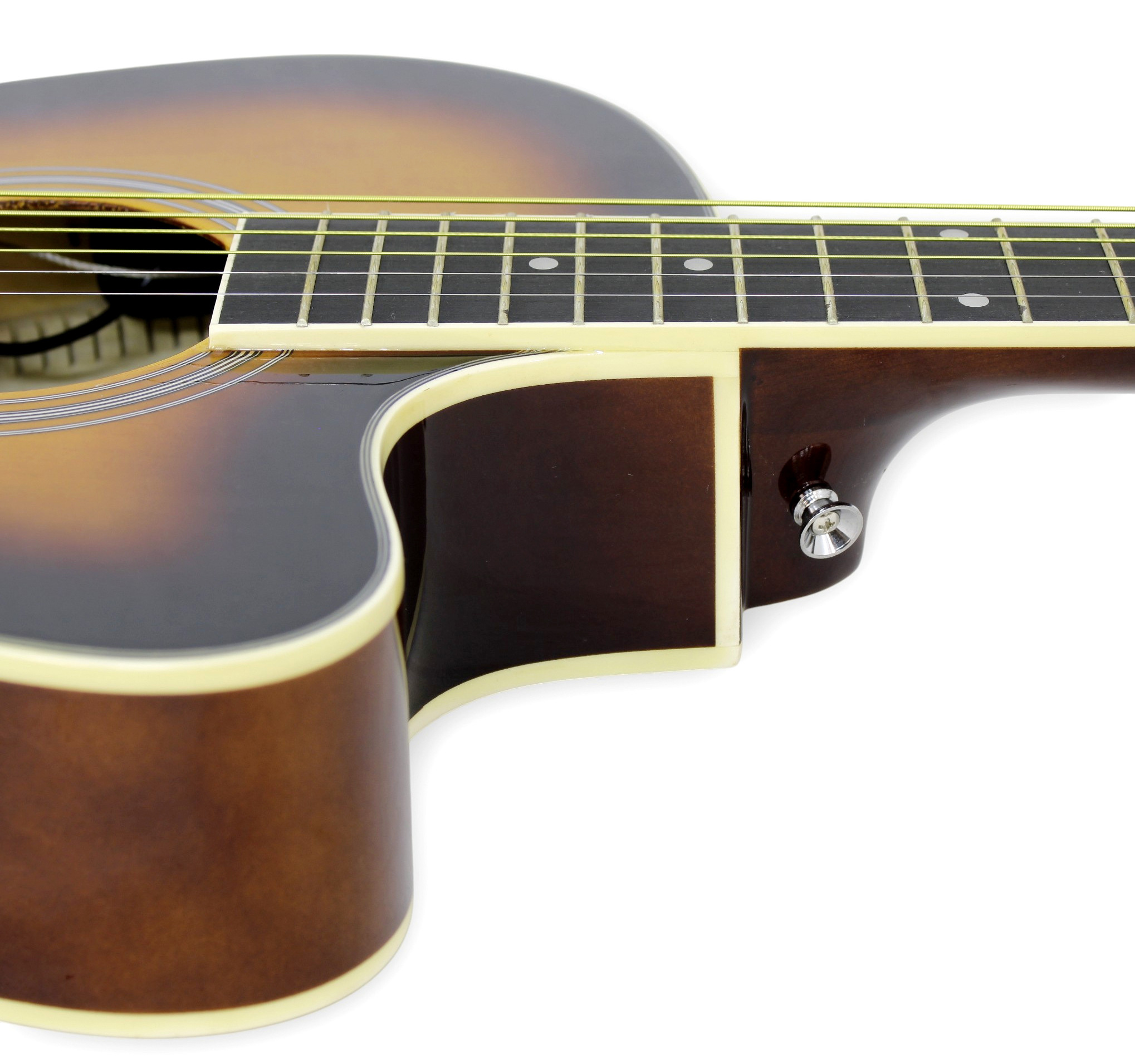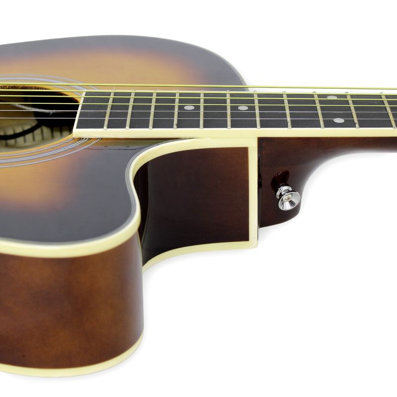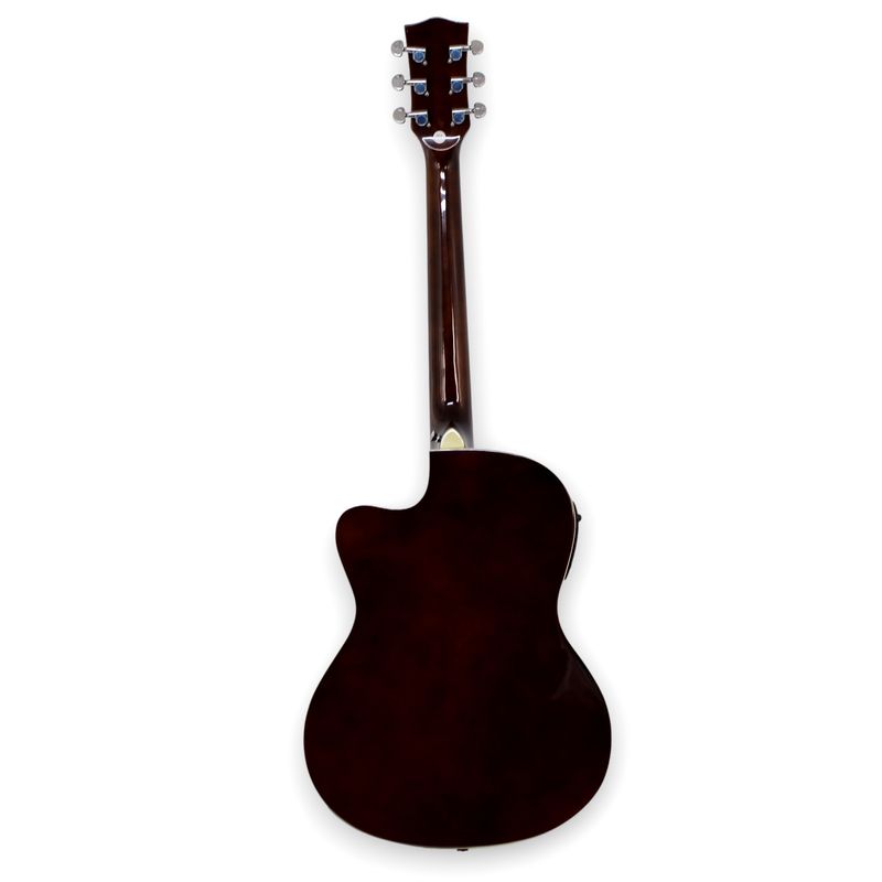 El cuerpo está diseñado para ofrecer un equilibrio entre comodidad y proyección sonora, entregando un tono claro, definido y con buena presencia en medios y agudos, propio de las cuerdas de metal. Su construcción sólida asegura estabilidad estructural y una respuesta consistente tanto en uso acústico como amplificado.