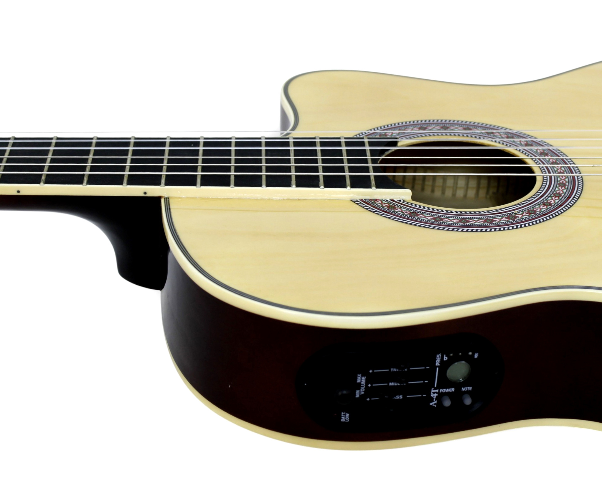 Fabricada con maderas seleccionadas, presenta un cuerpo de tamaño 4/4, un mástil de ancho clásico y un práctico cutaway, que facilita el acceso a los trastes más agudos. Incorpora un diapasón sólido de engineered wood, material reconocido por su estabilidad, durabilidad y respuesta consistente, que contribuye a un buen rendimiento tanto en sonido acústico como amplificado.