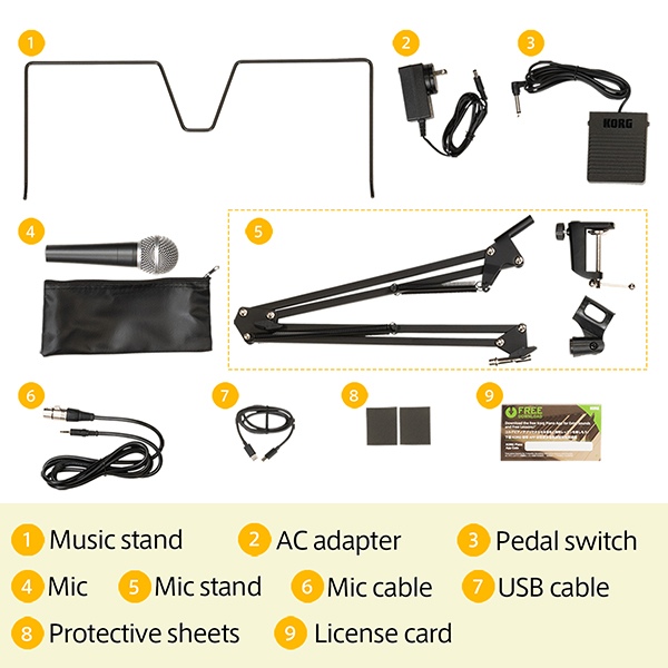 El kit Korg L1 Liano Live incluye accesorios esenciales para comenzar a tocar de inmediato, como atril para partituras, pedal de sustain, micrófono con soporte y cable USB.