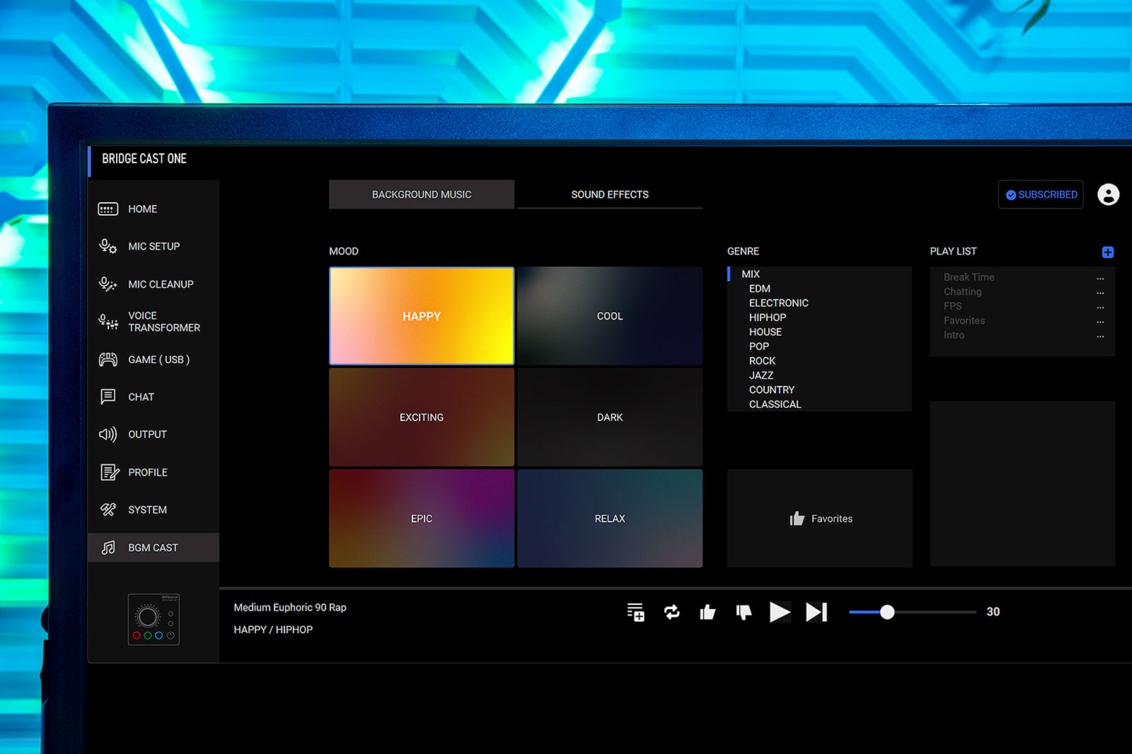 Con BGM CAST, nunca lo has tenido tan fácil para añadir música de fondo y color sonoro a tus emisiones. Disponible a través de la app BRIDGE CAST y Roland Cloud, BGM CAST te ofrece una creciente selección de música de fondo libre de derechos y efectos de sonido. Elige música por ambiente y género o crea listas de reproducción de tus favoritos para gestionar la música sin esfuerzo. También puedes asignar efectos de sonido a los botones físicos del BRIDGE CAST ONE para activarlos en el acto.