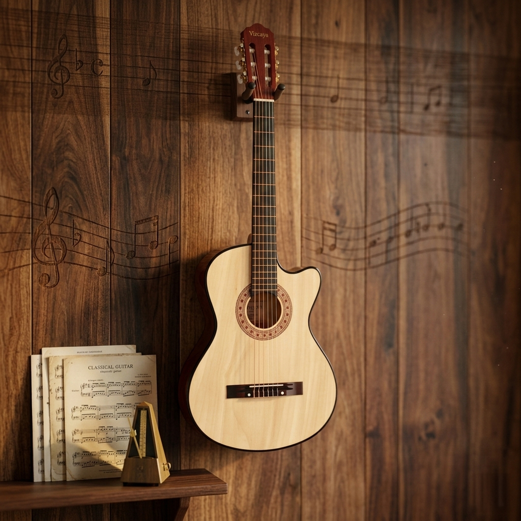 El aprendizaje técnico requiere un instrumento que se adapte al músico. Esta guitarra cuenta con un mástil de arce con perfil en D, una forma que proporciona un apoyo sólido y ergonómico para la mano, reduciendo la fatiga durante sesiones extensas de estudio. El diapasón de madera técnica con radio plano permite que la digitación de acordes y escalas sea fluida y precisa, respetando las dimensiones tradicionales de la luthería clásica con su cejuela de 52 mm. Este diseño técnico garantiza que el usuario pueda concentrarse en la ejecución y la postura correcta sin lidiar con la incomodidad de instrumentos mal balanceados.