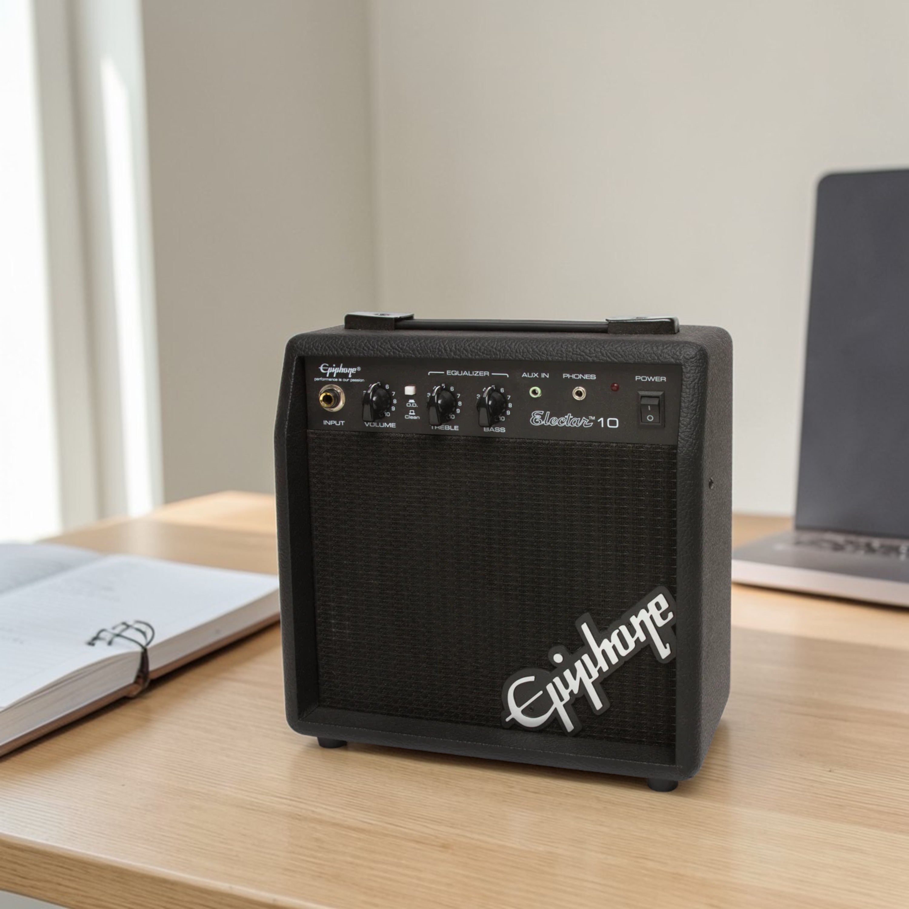 El amplificador incluido ofrece controles simples e intuitivos, con volumen, ecualización y opción de overdrive, permitiendo ajustar tu sonido fácilmente. Además, cuenta con entrada auxiliar para tocar junto a tus canciones favoritas y salida de audífonos para practicar en silencio.