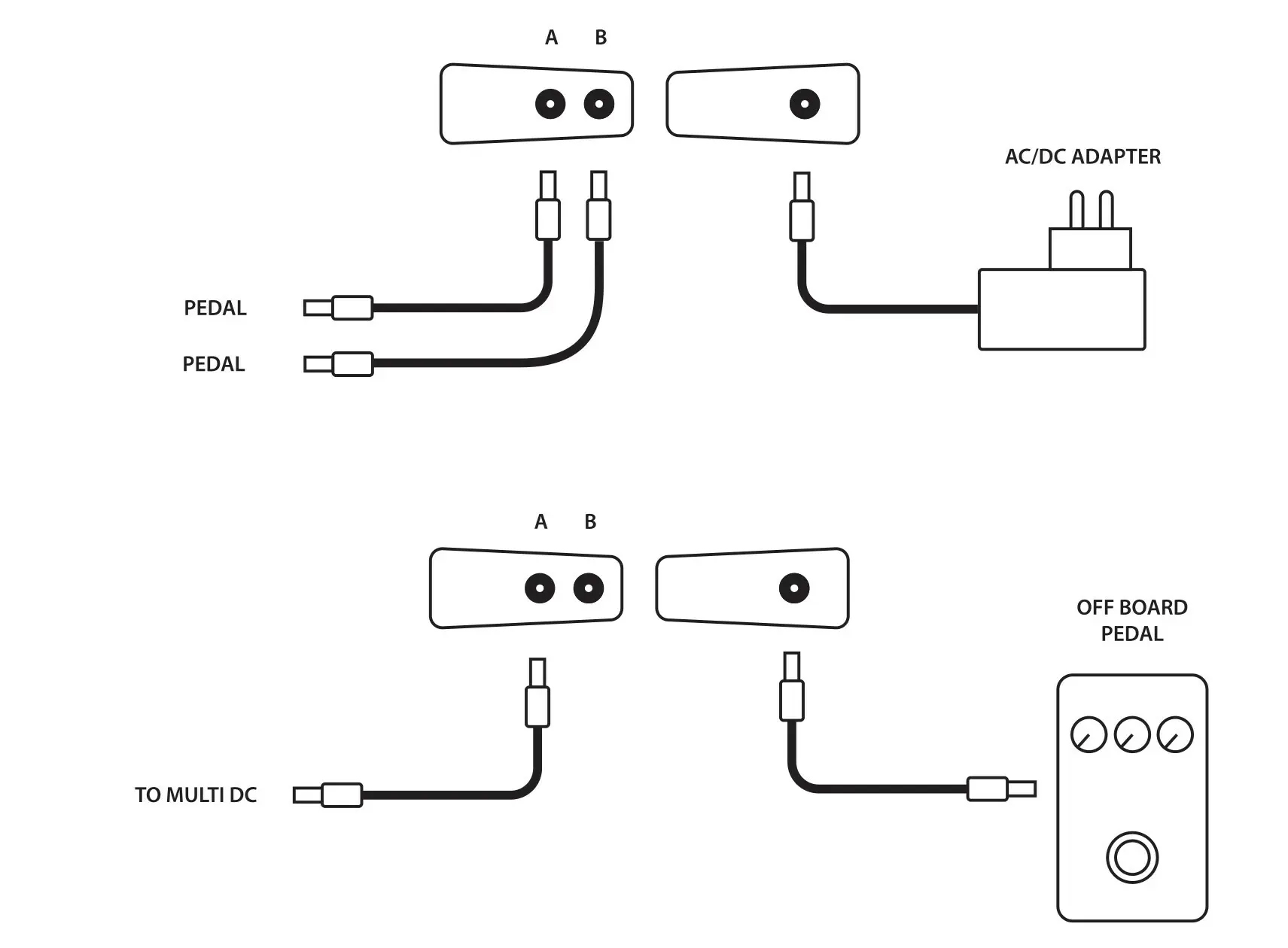El MOD DC utiliza un jack de entrada de 2,1 x 5,5 milímetros que se conecta internamente a dos jacks de salida paralelos (A y B) de la misma medida. Esta configuración de jack pasa-corriente permite que la energía se distribuya de manera eficiente a múltiples pedales o a la fuente de alimentación principal. Además, ofrece la flexibilidad de conectar pedales externos (como un Wah) en dirección opuesta si fuese necesario, optimizando el uso de cables de conexión y fuentes de poder.