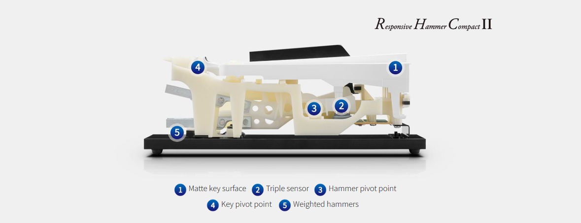La acción del teclado Responsive Hammer Compact II utiliza un preciso sistema de detección de teclas con triple sensor para una mayor fidelidad al sonido.
