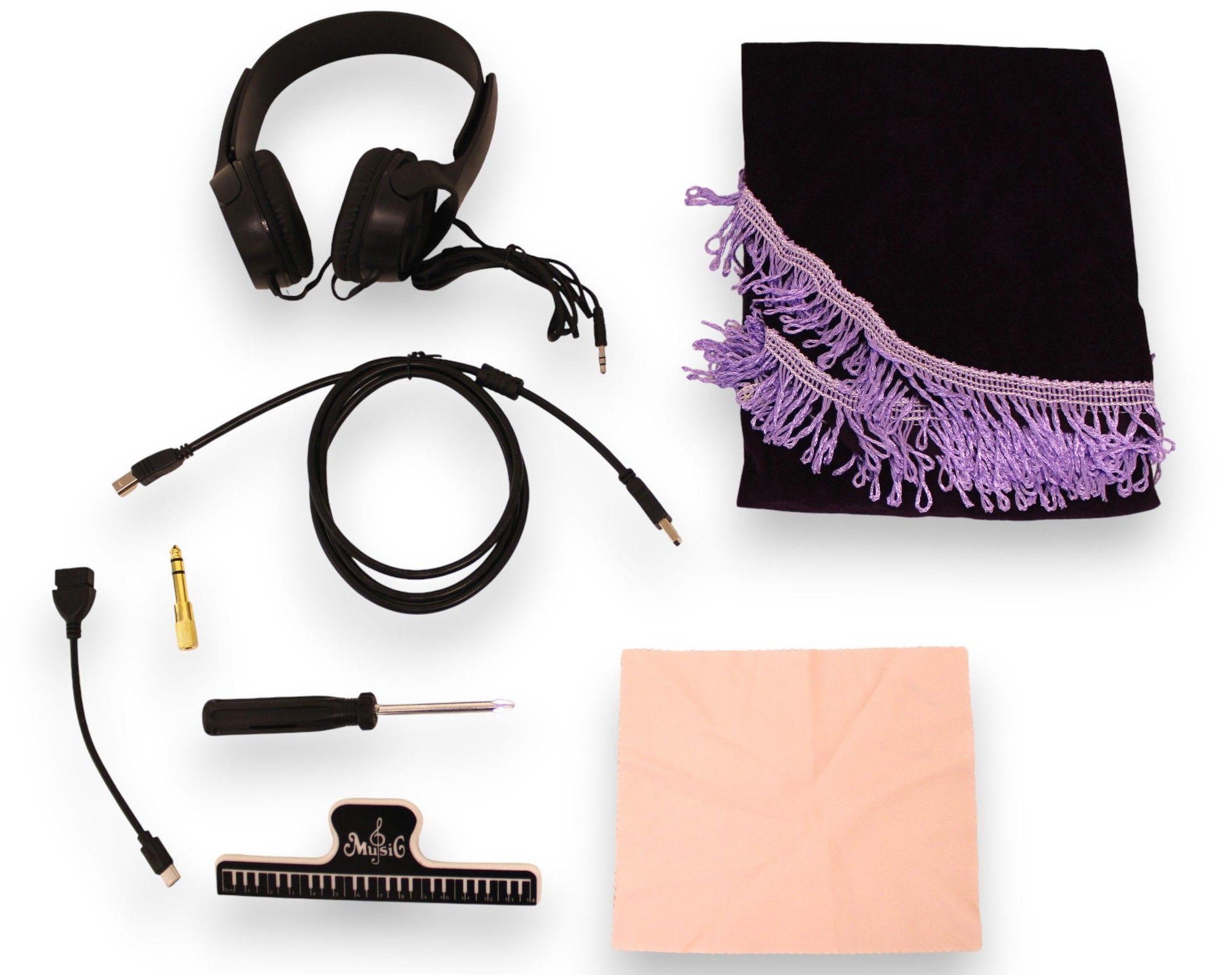 El paquete incluye atril de partituras, pedal triple, adaptador de corriente, manta cubrepolvo, cable USB y manual de usuario, ofreciendo todo lo necesario para comenzar a tocar desde el primer día.