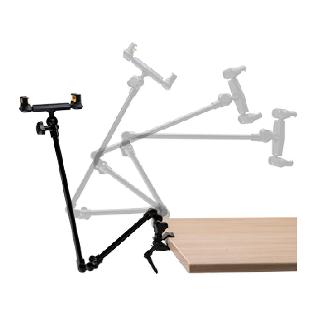 El sistema de sujeción del DG327B está diseñado para adaptarse a una amplia variedad de tablets, manteniéndolas firmemente en su lugar mientras permite interactuar cómodamente con la pantalla. Esto resulta ideal para cambiar páginas de partituras digitales, controlar software musical o revisar contenido en tiempo real durante una presentación.