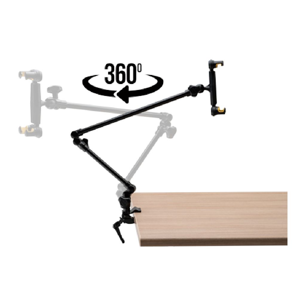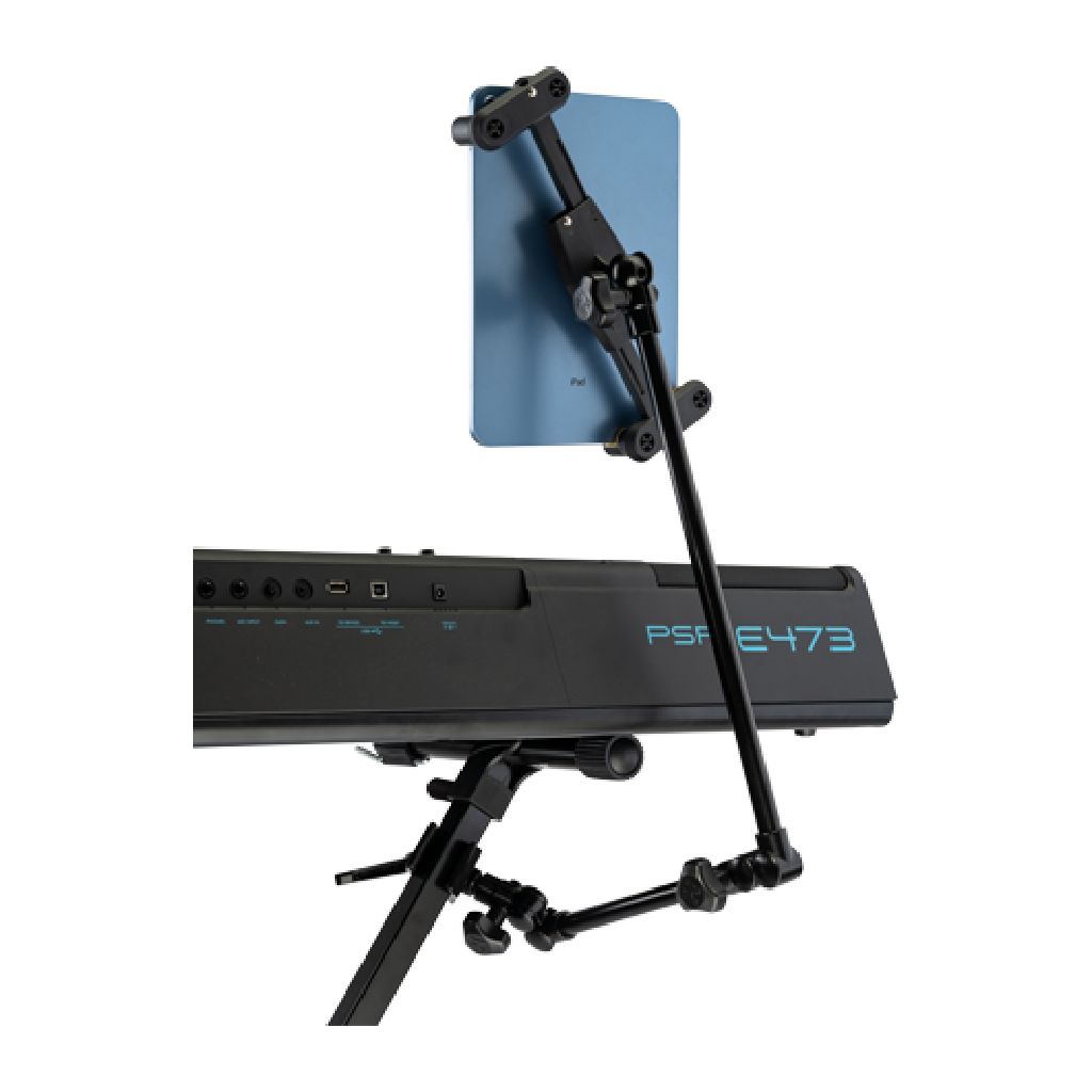 El soporte incorpora un brazo flexible tipo cuello de ganso que permite ajustar el ángulo y la orientación de la tablet con facilidad. Esto facilita encontrar la posición ideal de visualización sin interferir con el instrumento o el micrófono, adaptándose a distintas configuraciones de escenario o estudio.