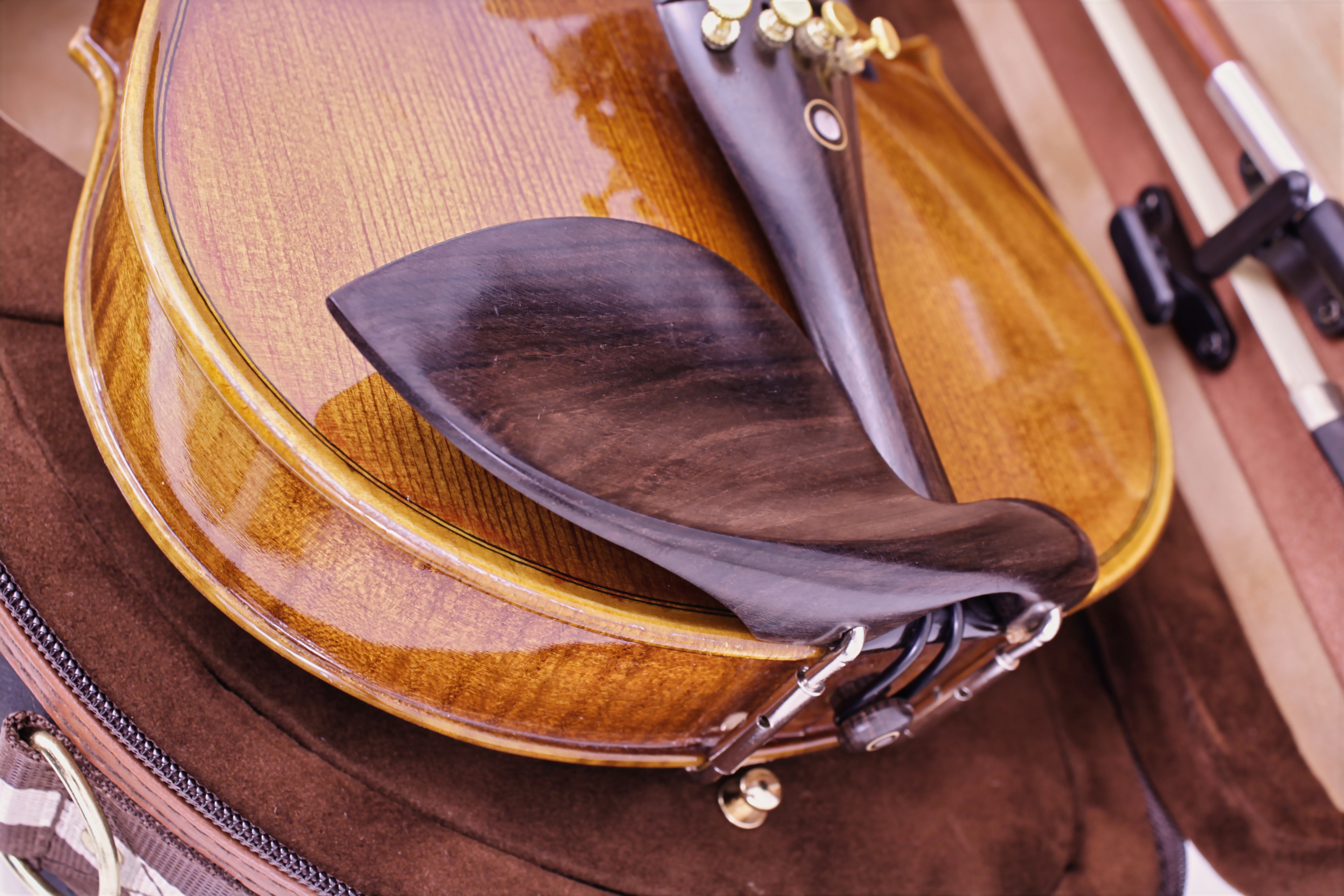 Una mentonera sólida para largos períodos de uso y un denso cordal con microafinadores mantienen una línea estética uniforme y elegante, reforzando la calidad visual y funcional del instrumento.